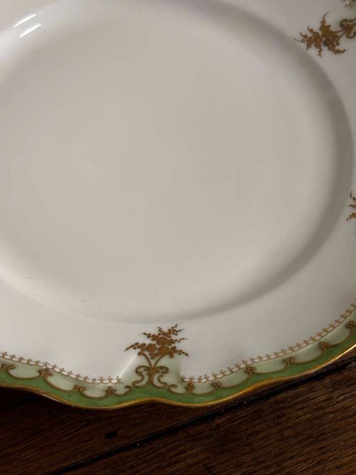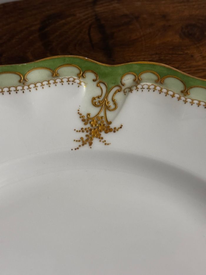 Fabrication française, estampillées porcelaine de limoges. Pourtour vert clair avec des dorures sur la tranche et des arabesques dorées en incrustation idéales pour une table élégante ou pour noël. elles sont rares, je n’en n’ai pas trouvé en vente sur internet. Porcelaine de haute qualité.