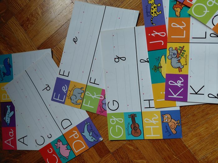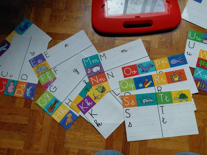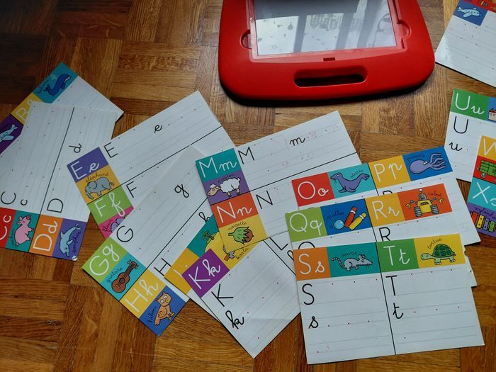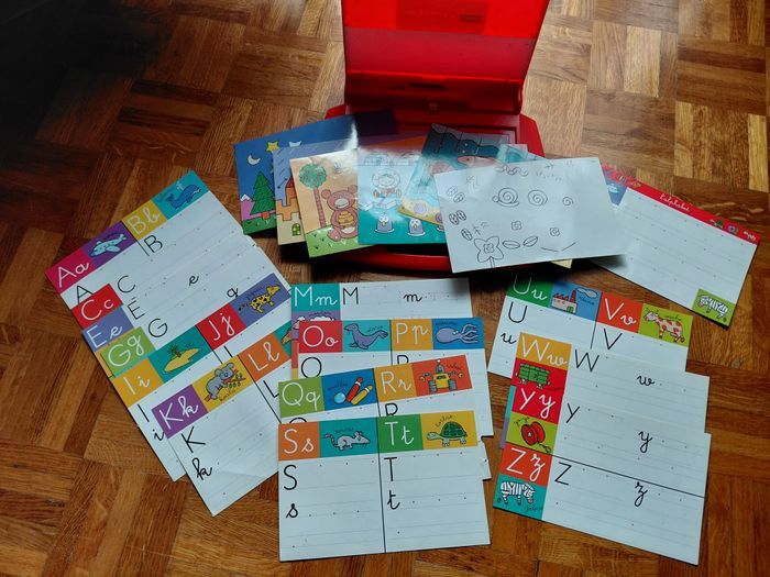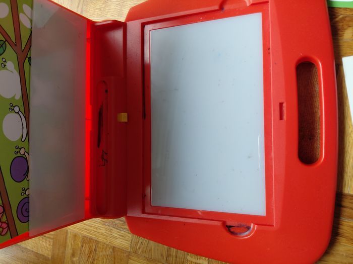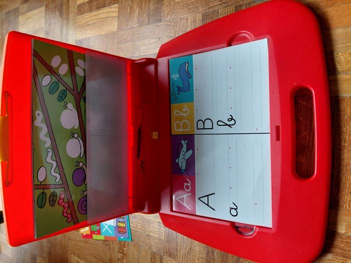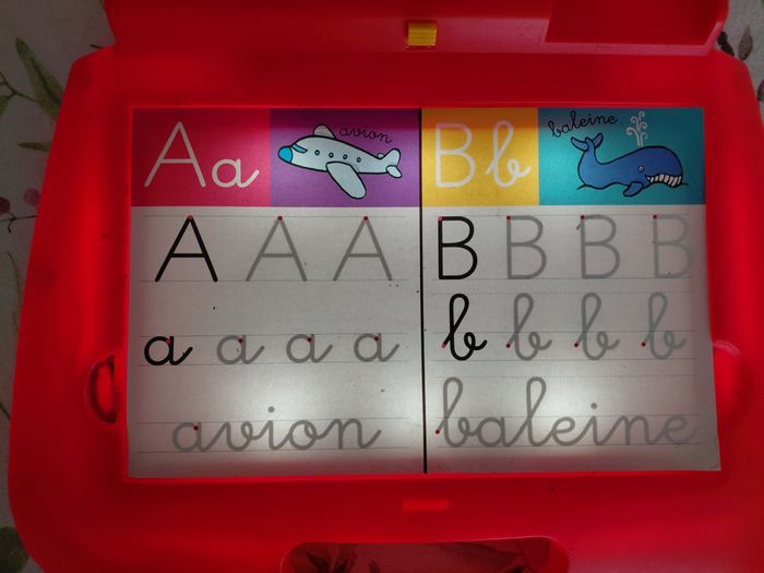 jeu j'apprends à écrire NATHAN les fiches se positionnent sur la partie blanche de la mallette en allumant la lumière (piles à changer) l'enfant dessine avec un feutre effaçable ( non fourni) mallette complète, traces d'utilisation voir photos