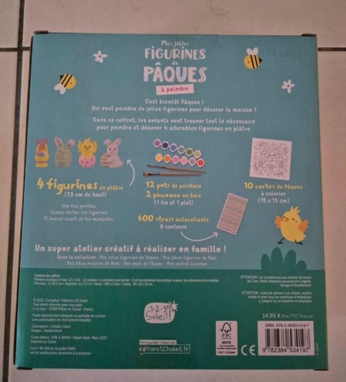 Bonjour 👋 je vends ce petit coffret : Mes jolies figurines de pâques à peindre neuves. Valeurs neuve 14.95€ en boutique. Envoie rapide et soigné possible 👌 Envoie dans les 24h pendant le mois de décembre ou si demandé en dehors 👍 Beaucoup d'autres jeux/jouets en vente, n'hésitez pas a y jeter un œil 😁 ⚠️Offre mois de décembre : je fais -10% sur le total si 2 jeux/jouets minimum acheté ⚠️