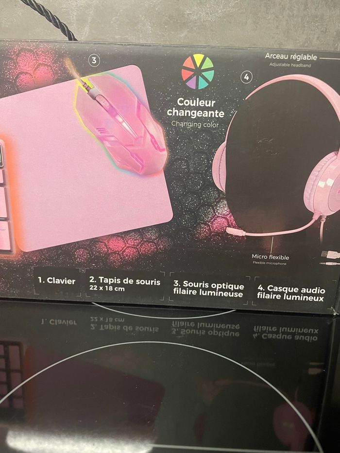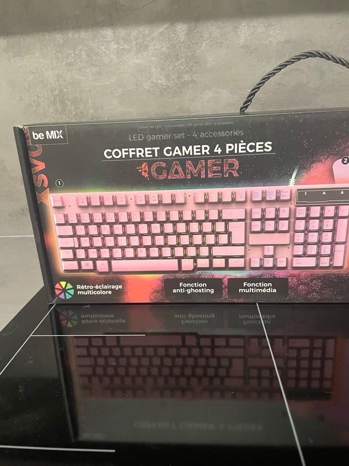 Neuf boîte encore scellée Coffret Gaming Rose contenant : - 1 clavier avec rétro-éclairage et fonctions anti-ghosting et multimédia - 1 tapis de souris 22x18cm - 1 souris optique filaire lumineuse - 1 casque audio filaire lumineux. Le kit complet avec tous les indispensables. Clavier avec rétro-éclairage multicolore, fonction anti-ghosting et fonction multimédia. Souris et casque avec éclairage multicolore. Couleurs changeantes. Idéal pour les gamers. Dimensions : 20 x 18,9 x H8,5cm. Marque Be mix