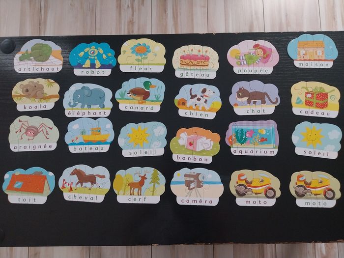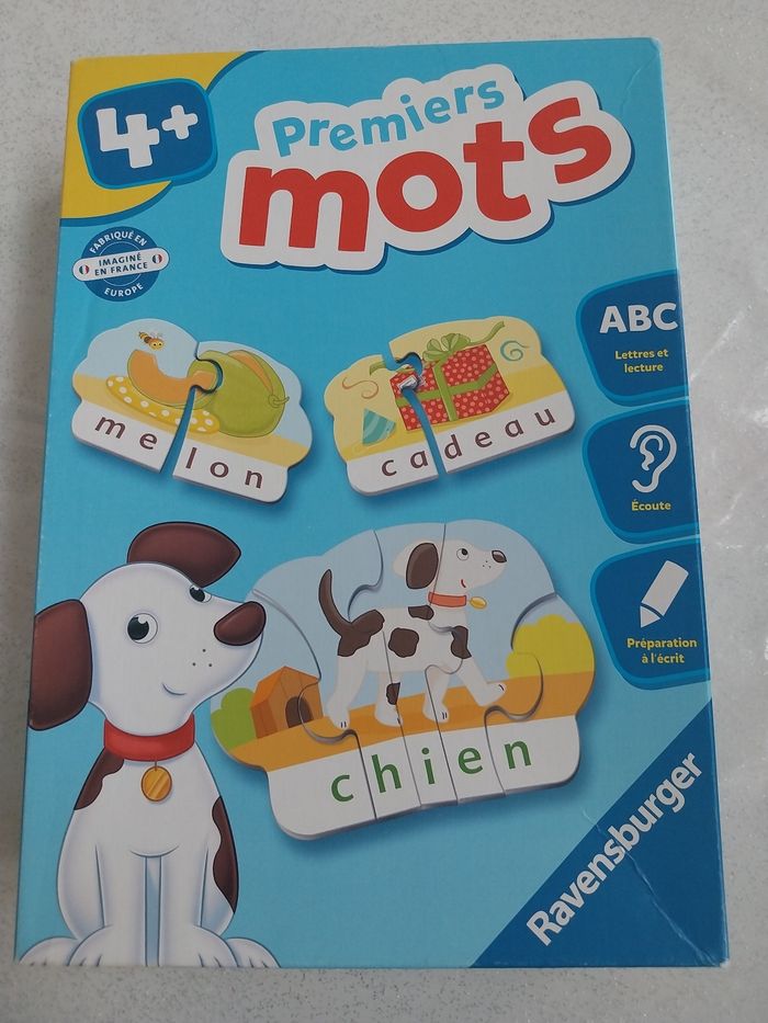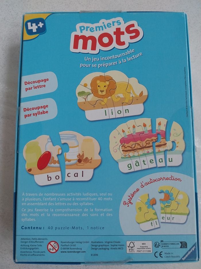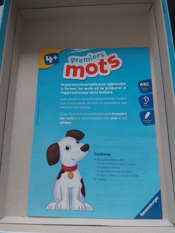 Puzzles des mots pour enfants à partir de 4 ans. Les mots sont découpés par lettre ou par syllabe, voir descriptif complet du jeu au dos de la boîte (photo 4). Fourni avec la notice, il y a 39 mots sur 40 la boîte est légèrement abîmée sur le devant (voir photo 1).