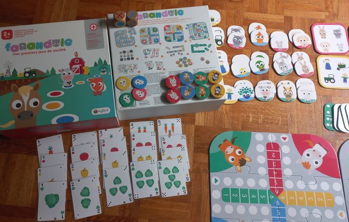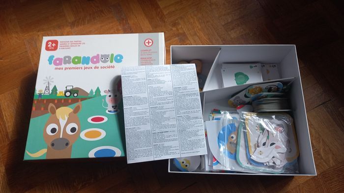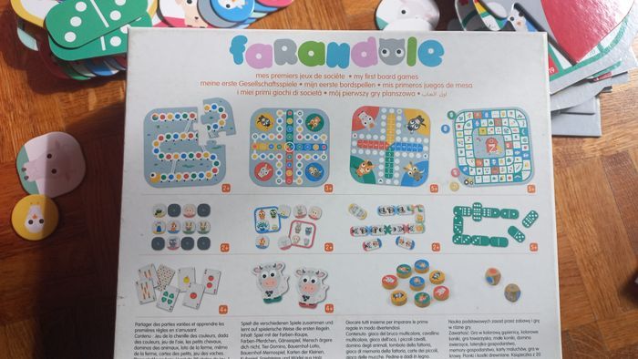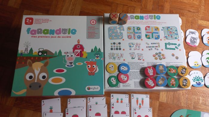 boite de jeux de société FARANDOLE - OXybul boite Mes premiers jeux de société de chez OXYBUL, petits chevaux, dominos à dessins et à points, jeu de l'oie, loto, mémroy... notice, semble complet excellent état, cartes rangées dans pochettes plastifiées protégées