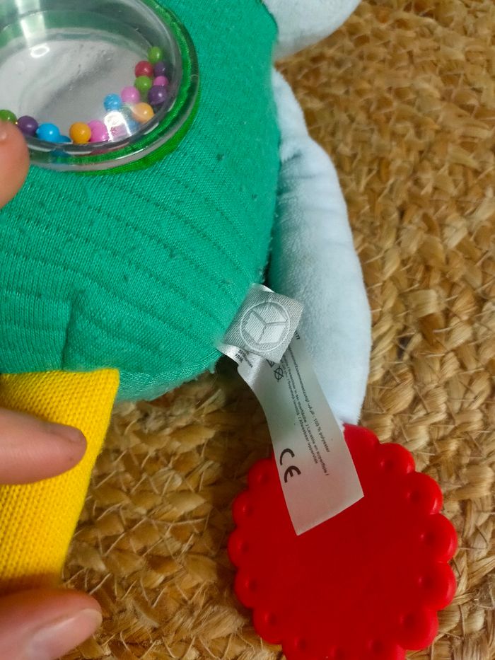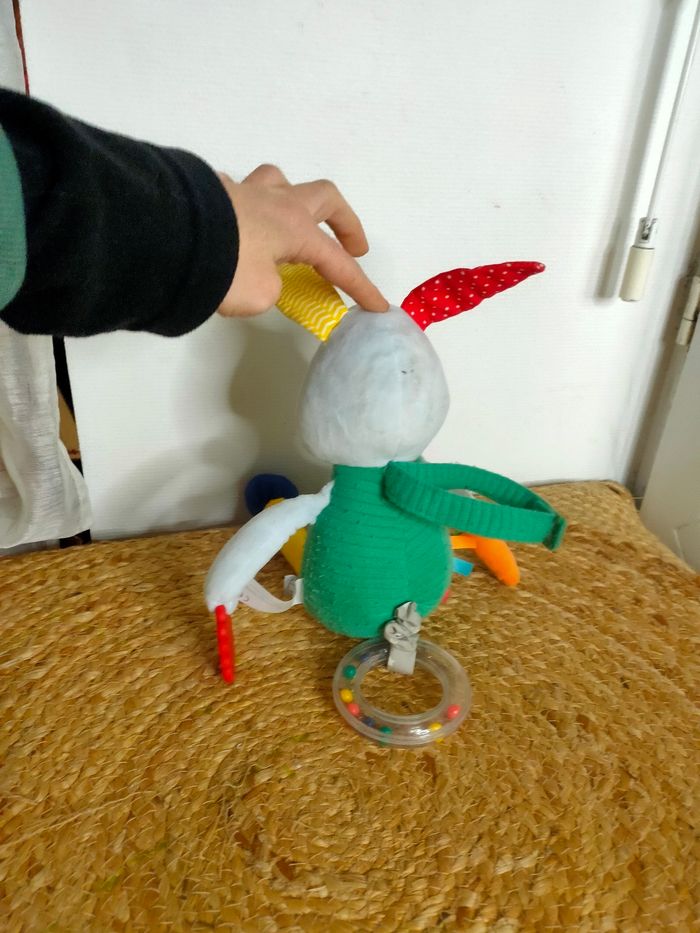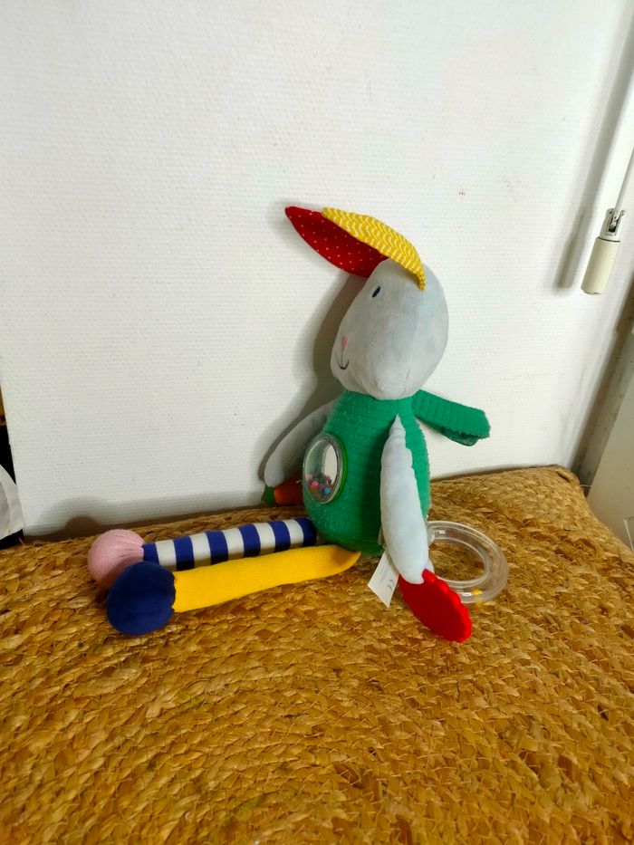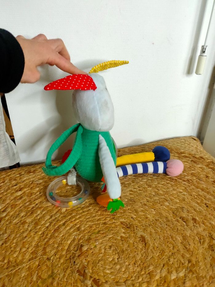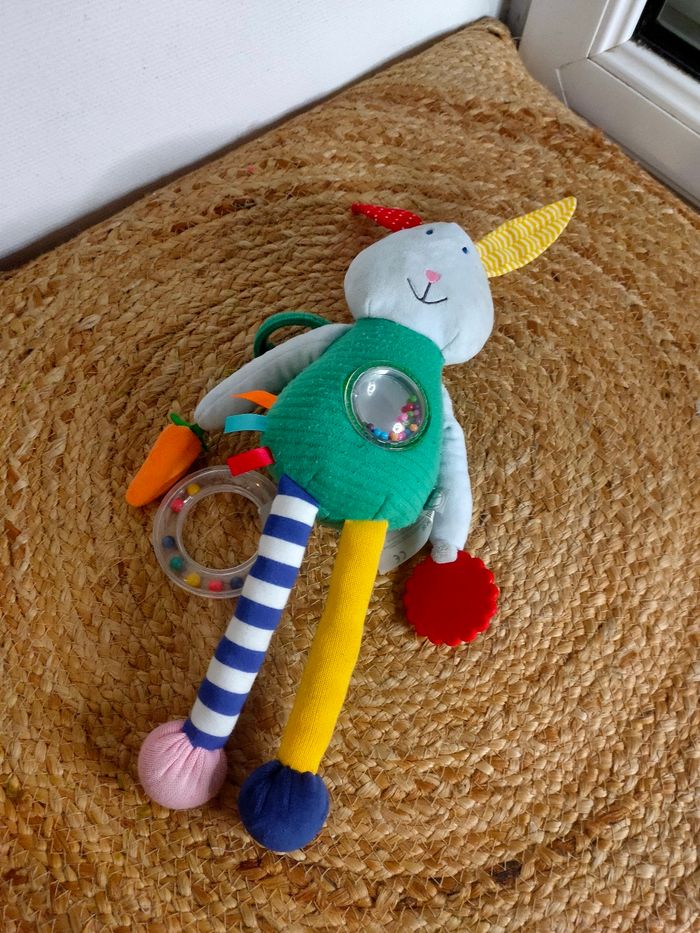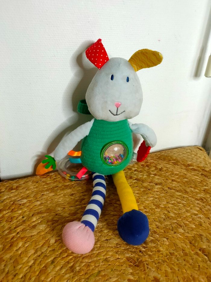 Léandre le lapin musical recèle des surprises à découvrir... Association de matières, couleurs pétillantes et extrêmement doux, il propose de nombreuses activités à votre bébé pour mettre ses sens en éveil : anneau de dentition, grelot, ventre et hochet à billes, oreilles en papier bruissant ou carotte à mâchouiller vont rythmer ses journées et Léandre va l'accompagner longtemps dans ses apprentissages. On tire l'anneau à billes pour déclencher la chanson de Frère Jacques ! Et puisqu'il va devenir un compagnon inséparable de votre bébé, les attaches dans le dos de Léandre lui permettent de l'emmener partout avec lui. Elle est en très bon état.