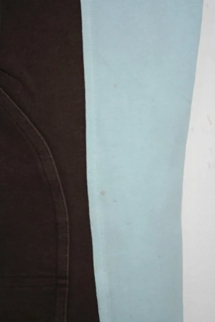 Pantalon d'équitation chocolat et bleu ciel, de chez Décathlon, taille 10 ans, quelques tâches sur le bleu ciel, 95% coton / 5 % élasthanne, 260g