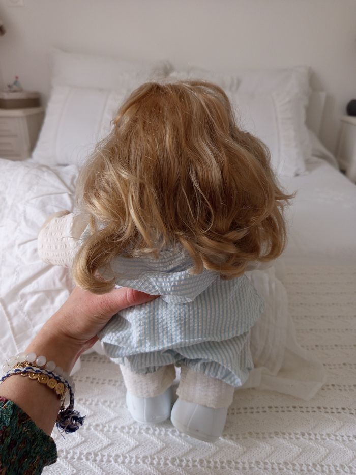 Cheveux blonds en bon état, légèrement ondulés Tenue d’origine : barboteuse rayée bleu et blanc avec broderie fleurs (légère petite tache au niveau des fesses, voir photo) + tee-shirt blanc, + veste assortie