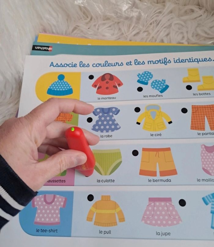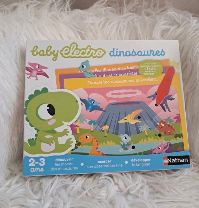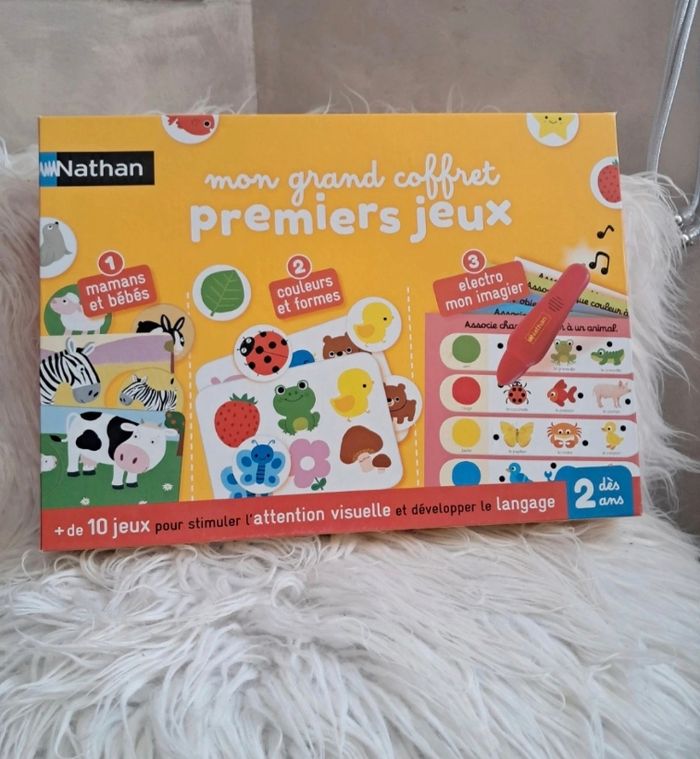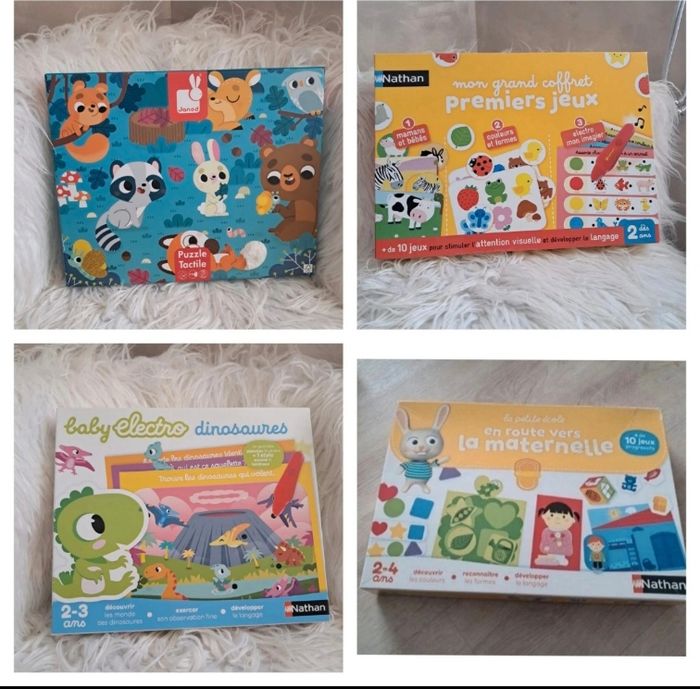 🎲 Lot de 4 jeux éducatifs dès 2 ans – Nathan & Janod 🎲 Idéal pour éveiller les tout-petits tout en s’amusant 💡 📦 Le lot comprend : ✨ En route vers la maternelle – Nathan (dès 2 ans) ✨ Mon grand coffret Premiers Jeux – Nathan (dès 2 ans) ✨ Baby Electro Dinosaures – Nathan (dès 2 ans) ✨ Puzzle géant tactile – Janod 🦕 Baby Electro Dinosaures Jeu neuf, juste déballé (peut-être utilisé 1x, sans certitude). 👉 Le stylo fonctionne parfaitement (photo). 🎨 Mon grand coffret Premiers Jeux Nathan Coffret ouvert mais jamais utilisé. Les ronds sont encore dans leurs cartons 📦 ⚠️ Un seul carton avec un petit défaut (rond rouge/bleu), sans incidence sur les pièces. Le stylo fonctionne ✅ Boîte légèrement abîmée sur le côté (stockage placard). 🧩 En route vers la maternelle Nathan Jeu complet, utilisé 2 fois seulement. Permet d’apprendre formes, couleurs, puzzles, observation et logique 🌈 Petite fissure sur la boîte (photo). 🐻 Puzzle géant tactile Janod Superbe puzzle tactile avec fourrure, paillettes et tissus variés ✨ Format 68×50 cm Poster réparé proprement (invisible une fois assemblé). Quelques traces au verso de certaines pièces, mais faces parfaites. 🏡 Maison non fumeur, première main, pas d’animaux. 📚 Je vends aussi des livres éducatifs (Trotro, Masha & Michka, Peppa Pig…) – lots dépareillables. 👉 D’autres jouets sur #laul57jouet