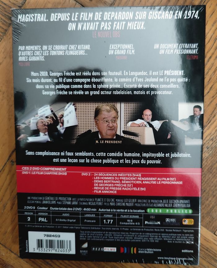 DVD neuf, d'origine et dans son emballage d'origine. Synopsis: 21 mars 2010. Georges Frêche est réélu dans son fauteuil. En Languedoc, il est LE PRÉSIDENT. Six mois durant, au fil d'une campagne ébouriffante et captivante, la caméra d'Yves Jeuland ne l'a pas quitté. Partout, hors champs et contrechamps, son oeil était là, dans le secret des conciliabules et les fins de banquet, face aux ténors des médias, dans son bureau, dans sa voiture, au saut du lit comme au bord de sa piscine... Bonus : - 24 séquences inédites (105') - Revue de presse radio/TV (60') - Les hommes du Président réagissent au film (12') - Denis Bertrand, sémioticien, analyse le personnage de Georges Frêche (12') - Bande-annonce