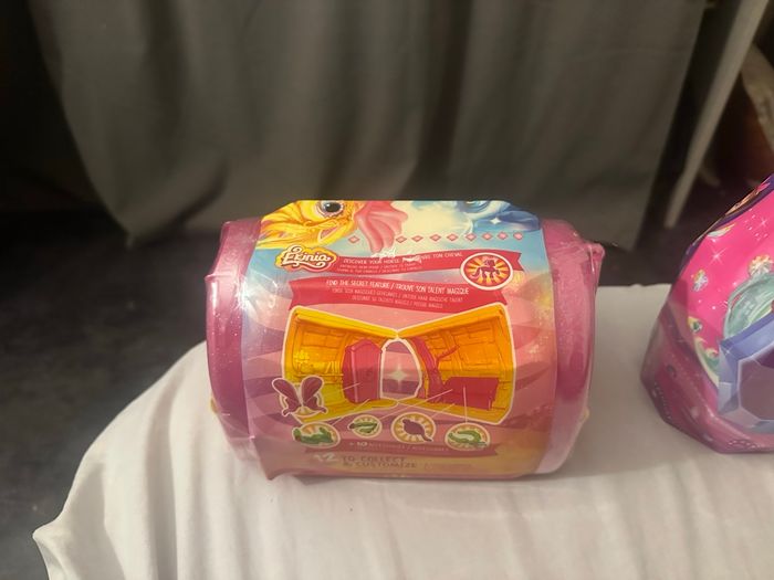 Ouvre vite ta box et découvre ton cheval et tous ses accessoires interchangeables : chaussures, ailes, couronnes… Découvre le secret magique de ton cheval : tatouage, fluorescent ou encore sa crinière qui change de couleur.prix du lot 30 euros