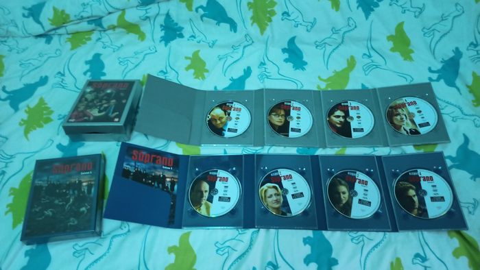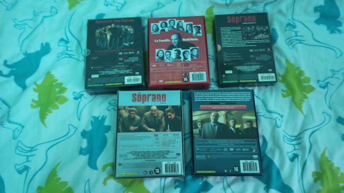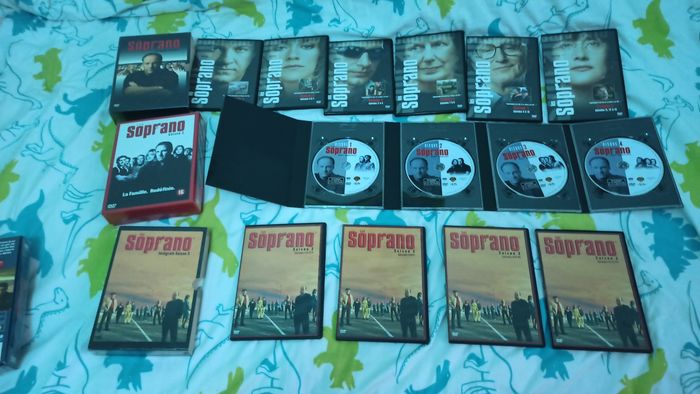 Lot 5 coffrets série TV Les Soprano (5 saisons). Parfait état. Les coffrets ont été recouverts d'un plastique protecteur. Plusieurs langues dont français et anglais. Sous-titres disponibles en français et anglais aussi. Je précise qu'il n'y avait pas de livret dans le coffret de la saison 4 quand je l'ai acheté neuve.