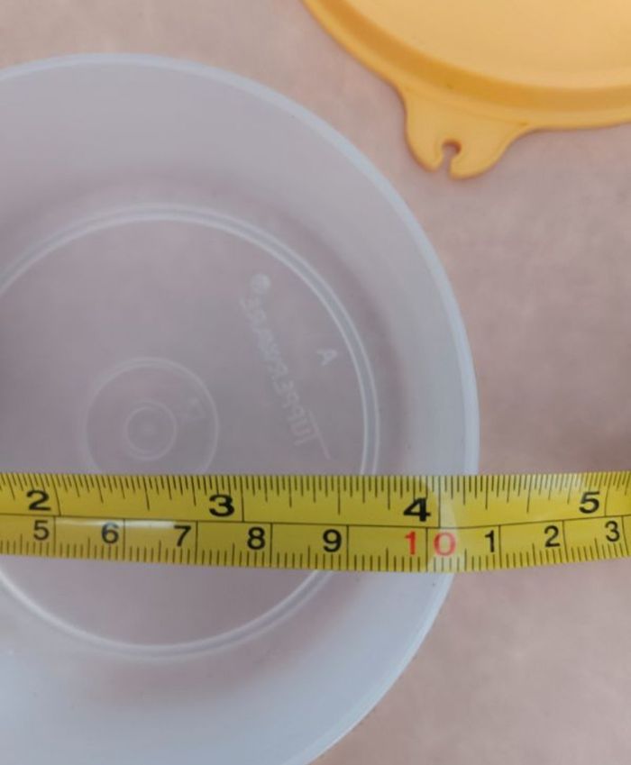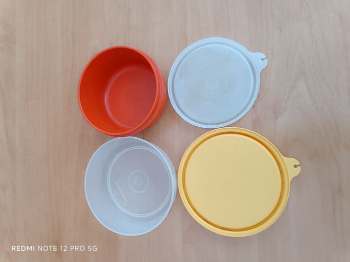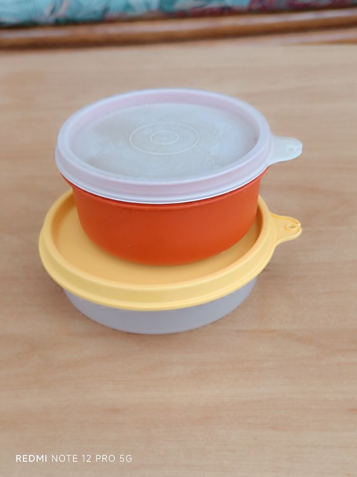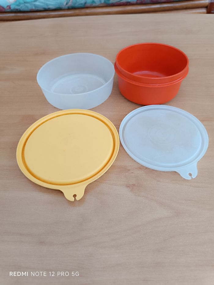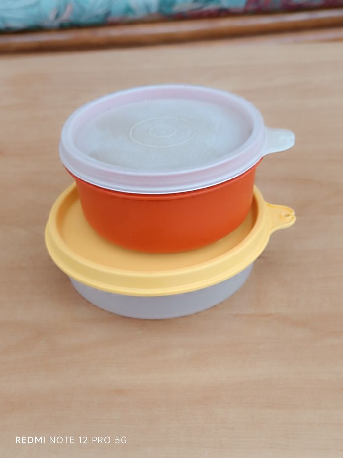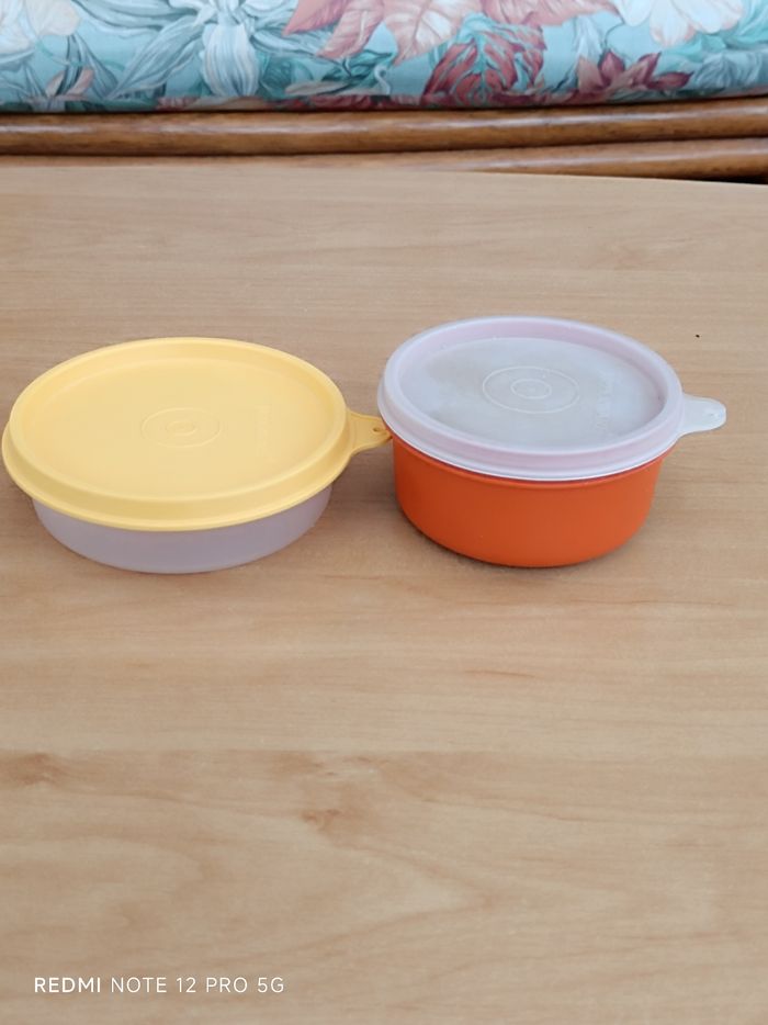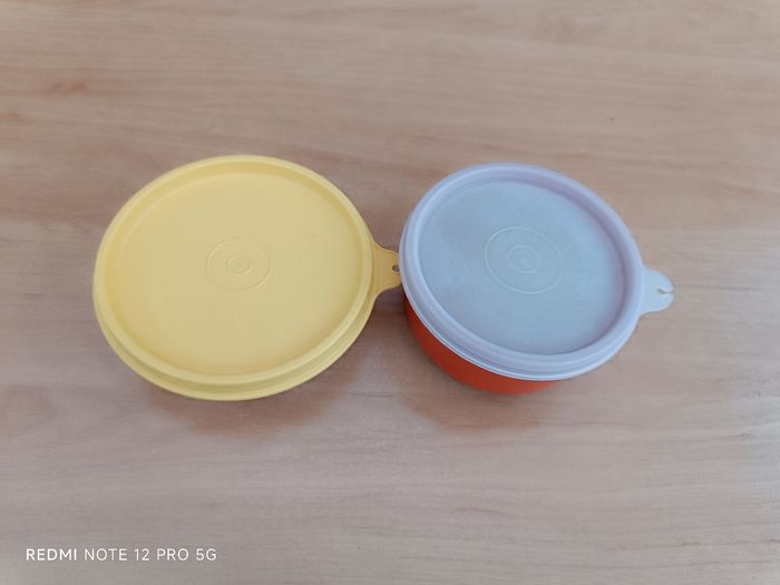 Ramequins Tupperware x2 vintage Tbe Orange : diamètre 9cm+ haut 5cm Couvercle jaune : diamètre 12 cm+ haut 4cm