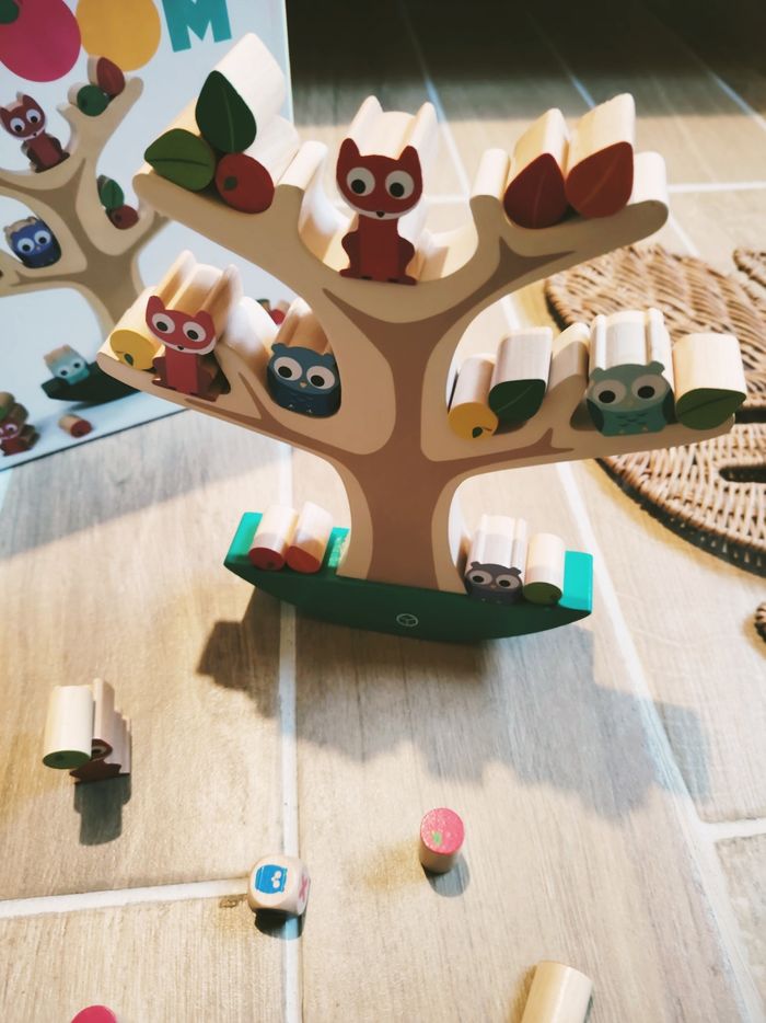 Qui arrivera à poser les petits animaux, les feuilles ou les pommes sans faire basculer l'arbre.