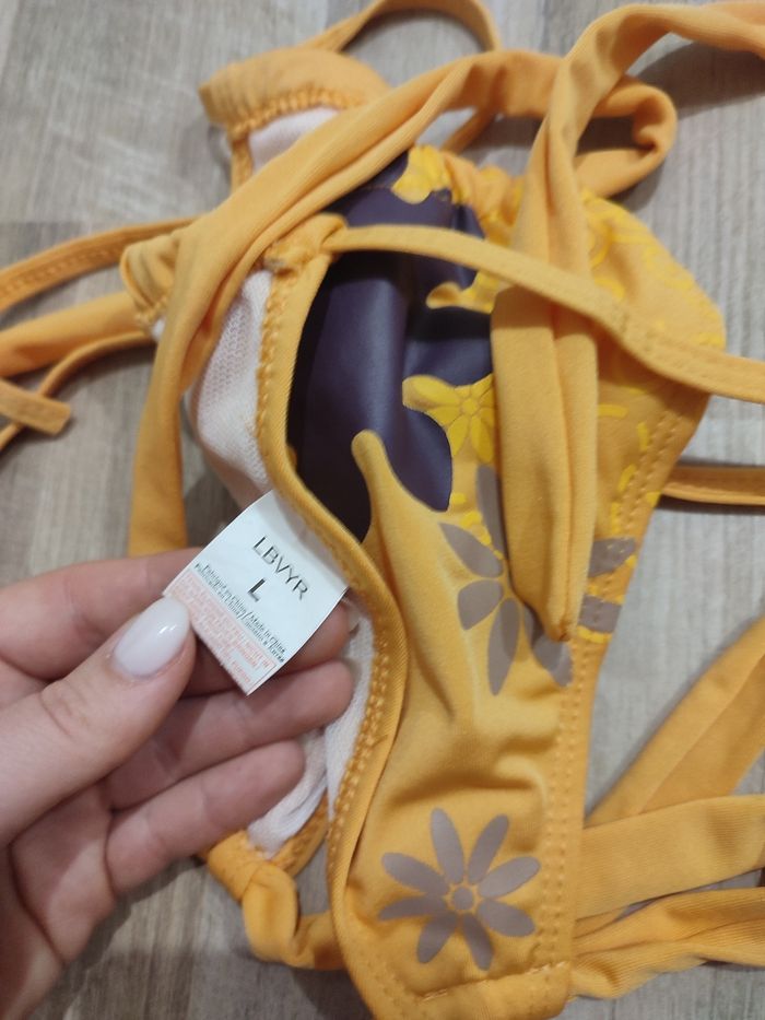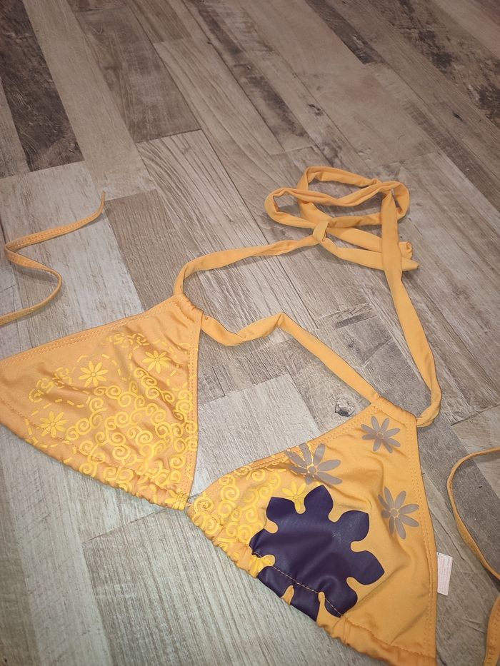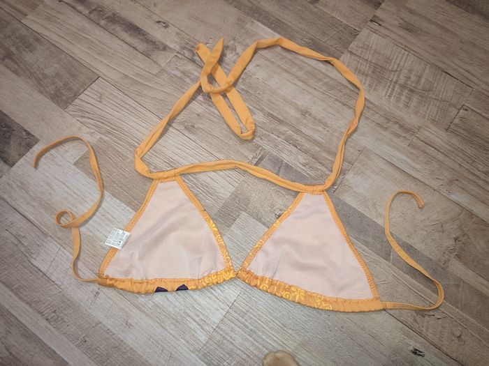 Haut de maillot triangle aux motifs fleuris dans les tons jaune et orange.