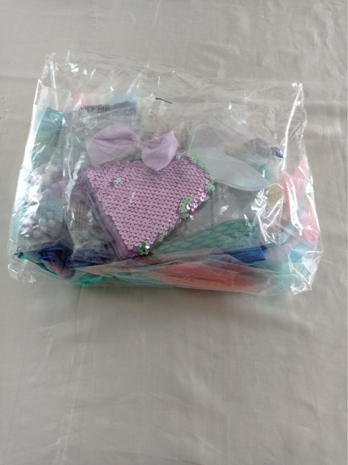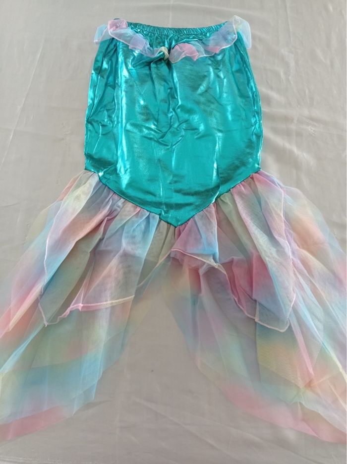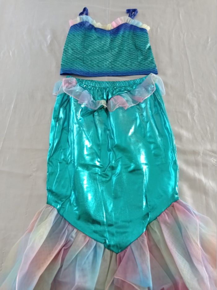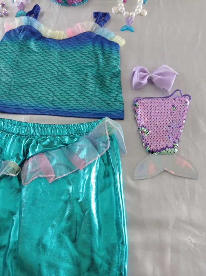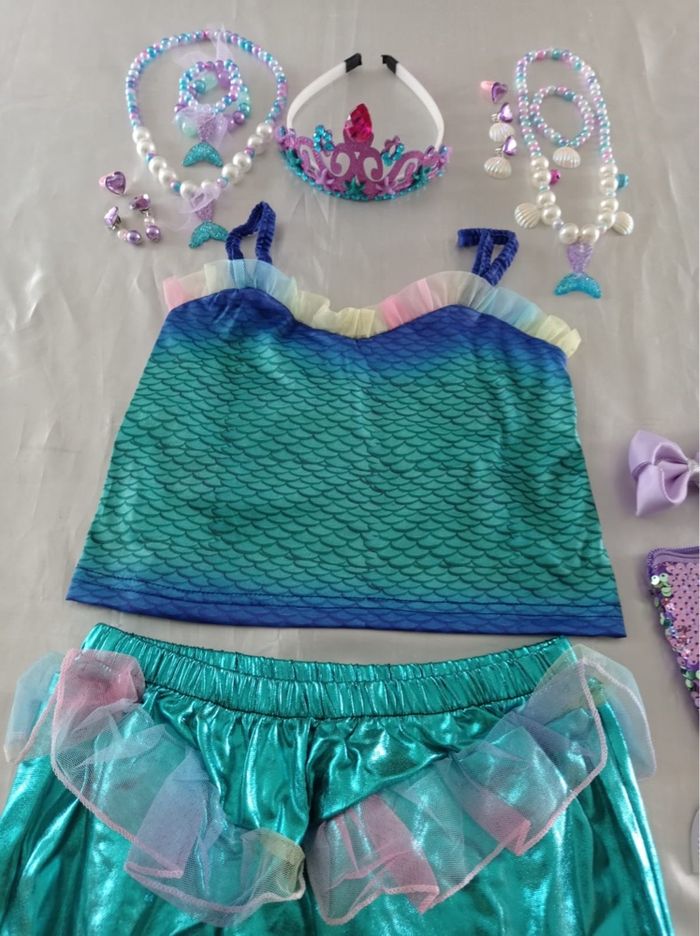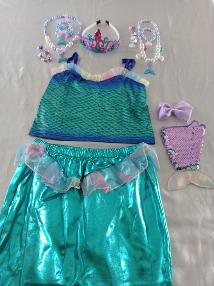 Déguisement sirène deux pièces et son lot d’accessoires (couronne, petit sac, colliers, bracelets, boucle d’oreille et bague). Le top mesure 30cm de longueur et la jupe 70cm de longueur, la taille convient aux petites filles de 7ans. Totalement neuve, vendue dans son emballage d’origine. Envoi rapide
