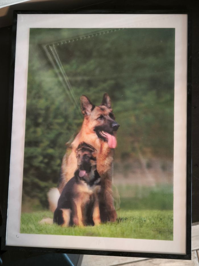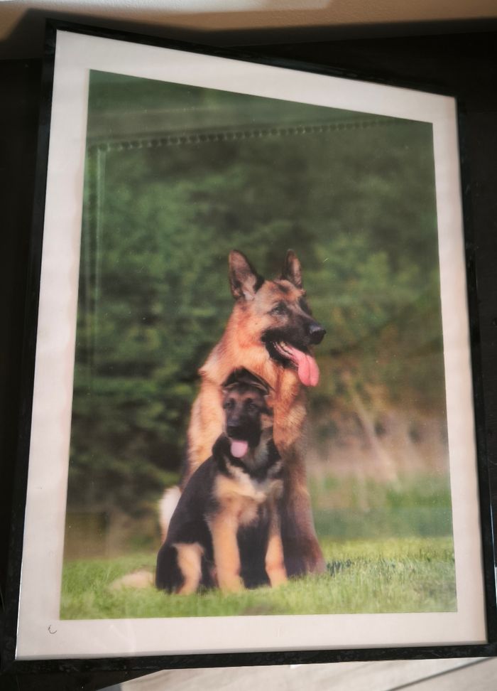 Joli cadre en 3 D représentant un berger allemand et son petit, 40,5 cm x 30,5 cm, état neuf.