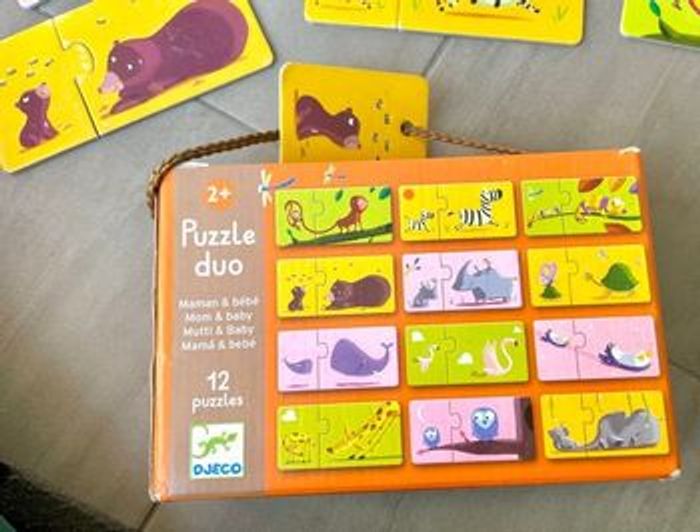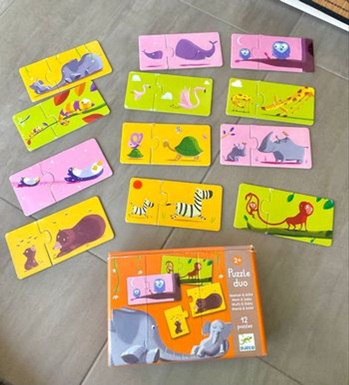 Vends cette boîte de 12 puzzles duo, le la marque Djeco en bon état (voir photos) et complet! À partir de 2 ans, Achetez en lot dans mon dressing pour activer la réduction automatique et rentabiliser vos frais de port 😉