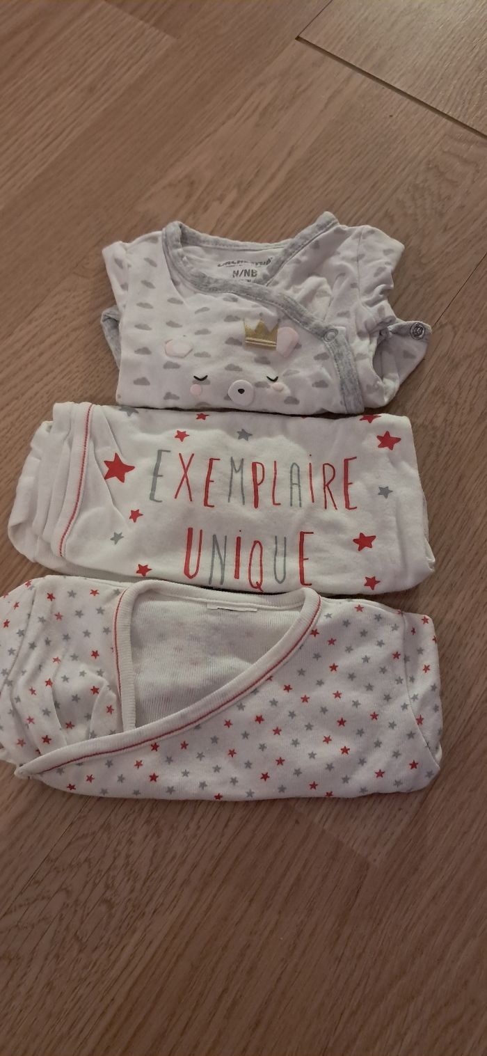 Lot de 3 bodies manches longues naissance Plusieurs marques très bon état. Plus de renseignements ou de photos n'hésitez pas à m'envoyer un petit message :)