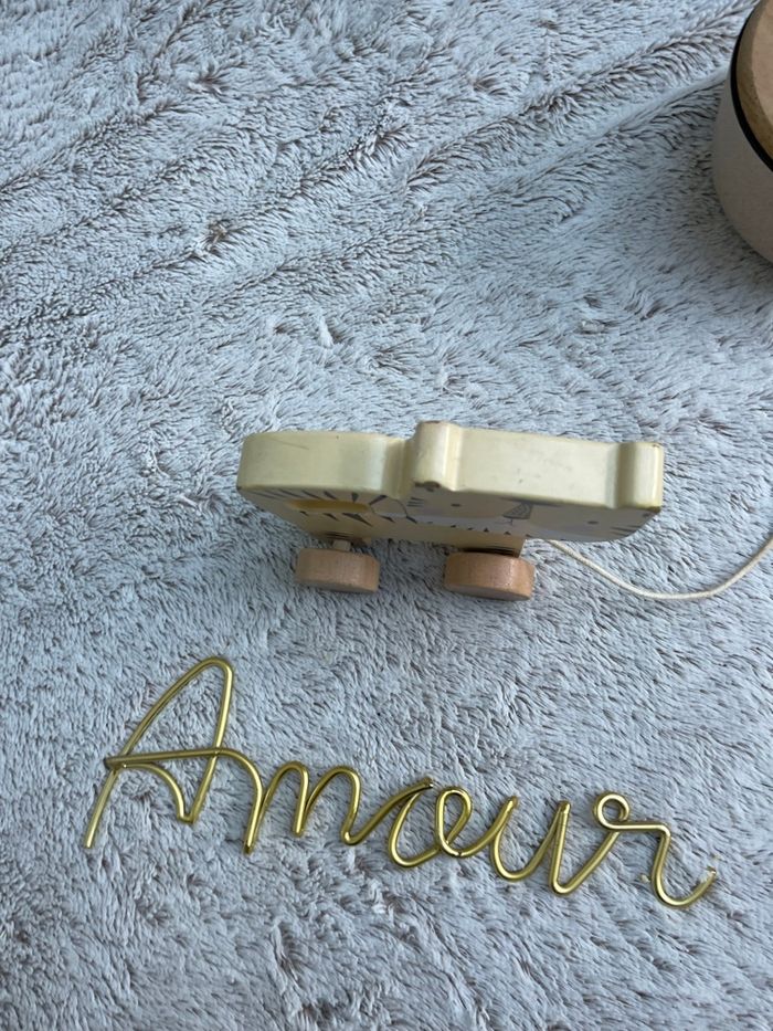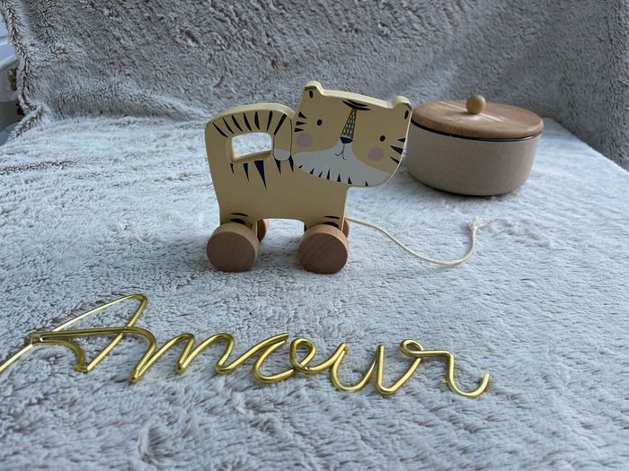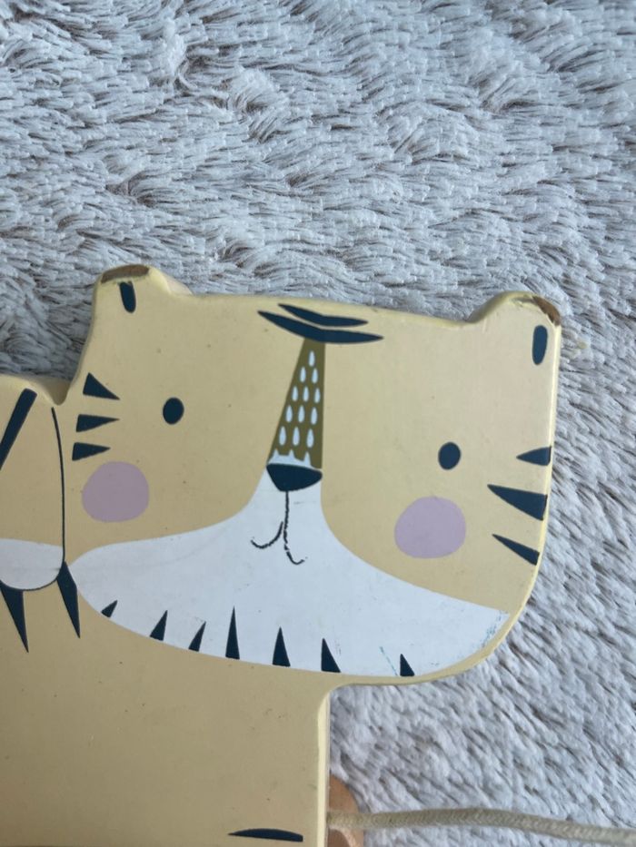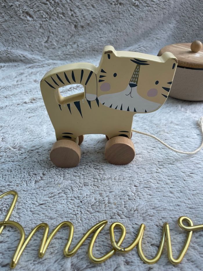 Tigre en bois à tirer Coloris jaune pale Très bonne état juste quelque petits impacts de peinture les oreilles. Voir photo Little Dutch