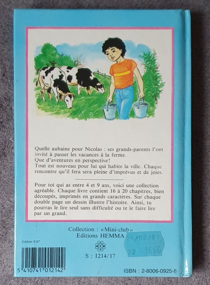 Résumé : Quelle aubaine pour Nicolas : Ses grands-parents l'ont invité à passer les vacances à la ferme. Que d'aventures en perspective! Tout est nouveau pour lui qui habite la ville. Chaque rencontre qu'il fera sera pleine d'imprévus et de joies.. Année de parution : 1987. Auteur : Jacques Thomas-Bilstein. Illustrateur : Jacques Geron. Collection : Mini-Club. Éditions : Hemma. =) 127 pages. Très bon état général! L'intérieur du livre est nickel!