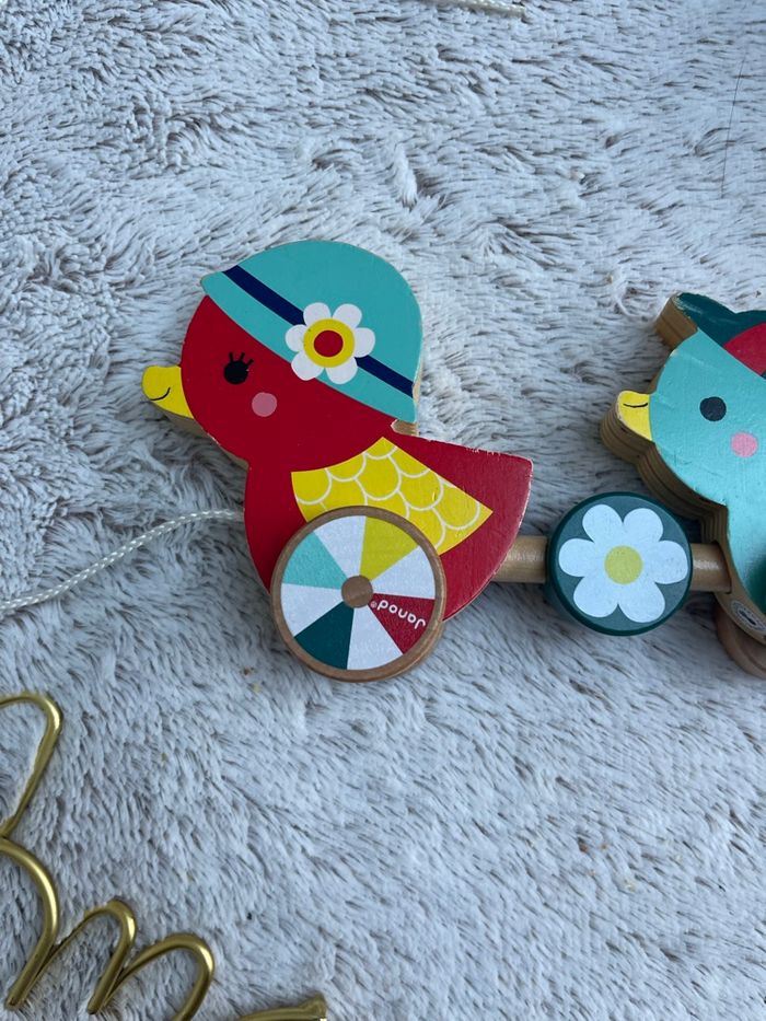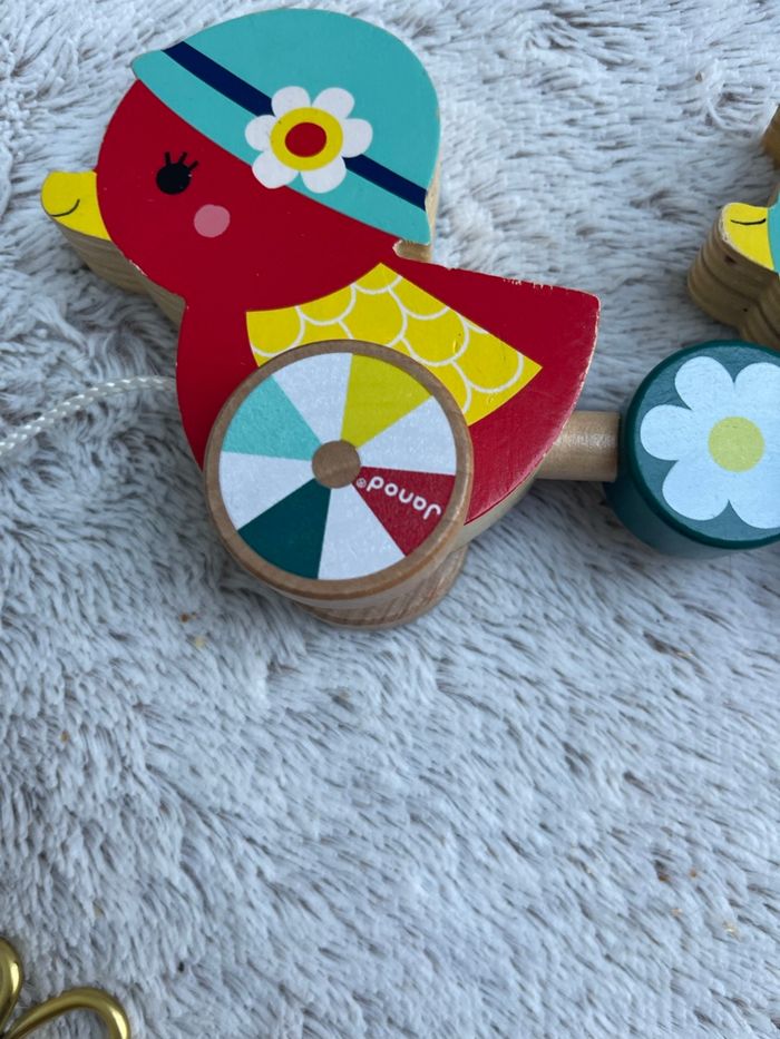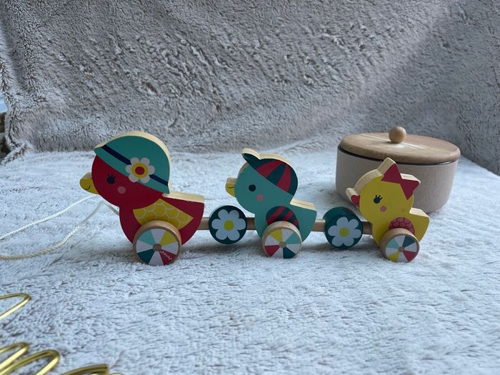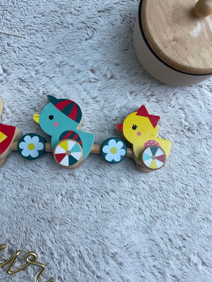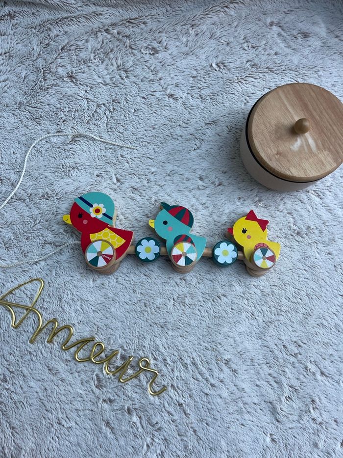 Famille canards à tirer en bois Baby Forest Très bonne état. Mes filles ont beaucoup jouer avec mais elles ont grandis et le jeu ne leur sert plus Janod