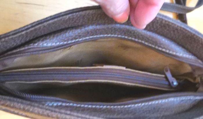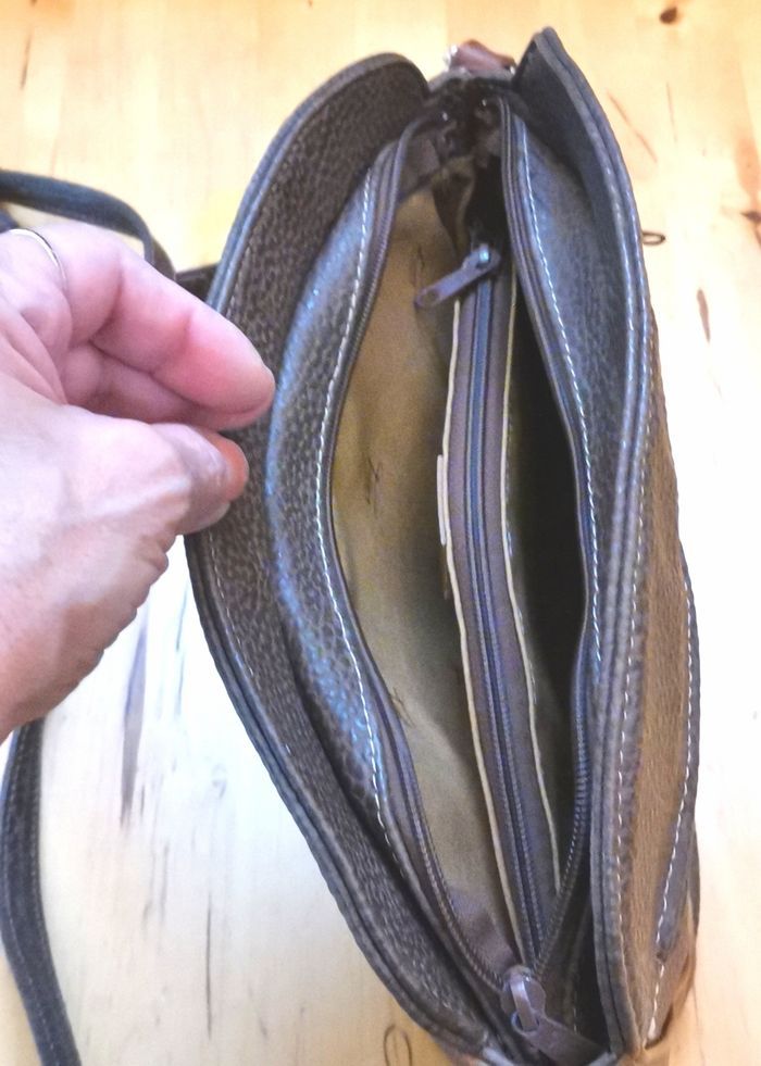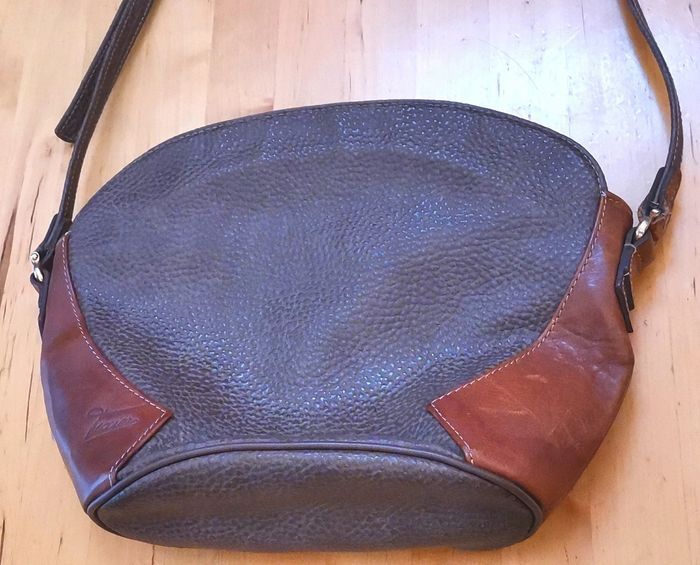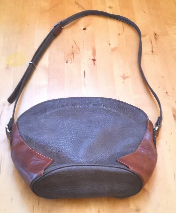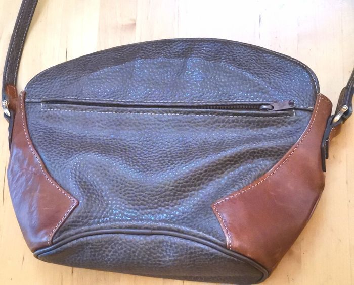 Sac à main bandoulière "Texier", style Vintage, en cuir grainé couleur marron, à détails en cuir marron clair lisse, plusieurs rangements, fermeture zippé, dimensions :30 cm x 21,5 cm x 10 cm, tbé, sans tâches, ni éraflure, ni écorchures.