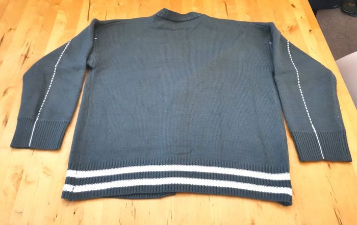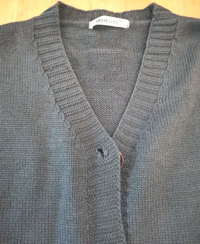 Gilet "Voyalles", en maille couleur gris à détails blancs, taille L, tbé.