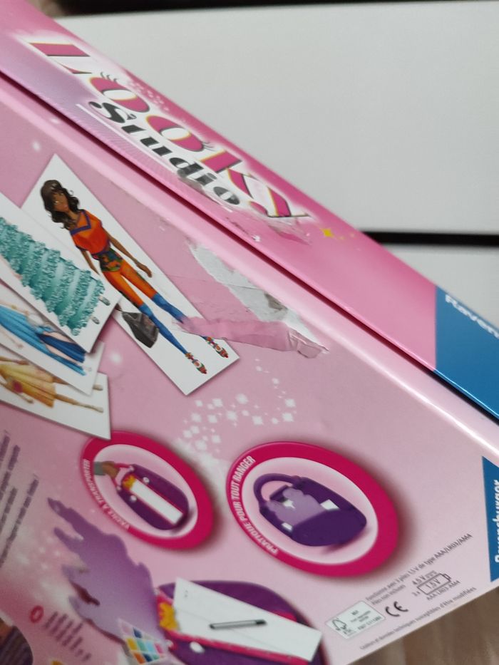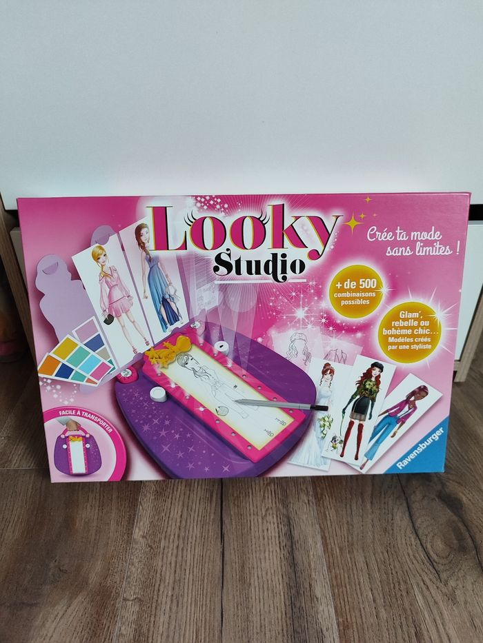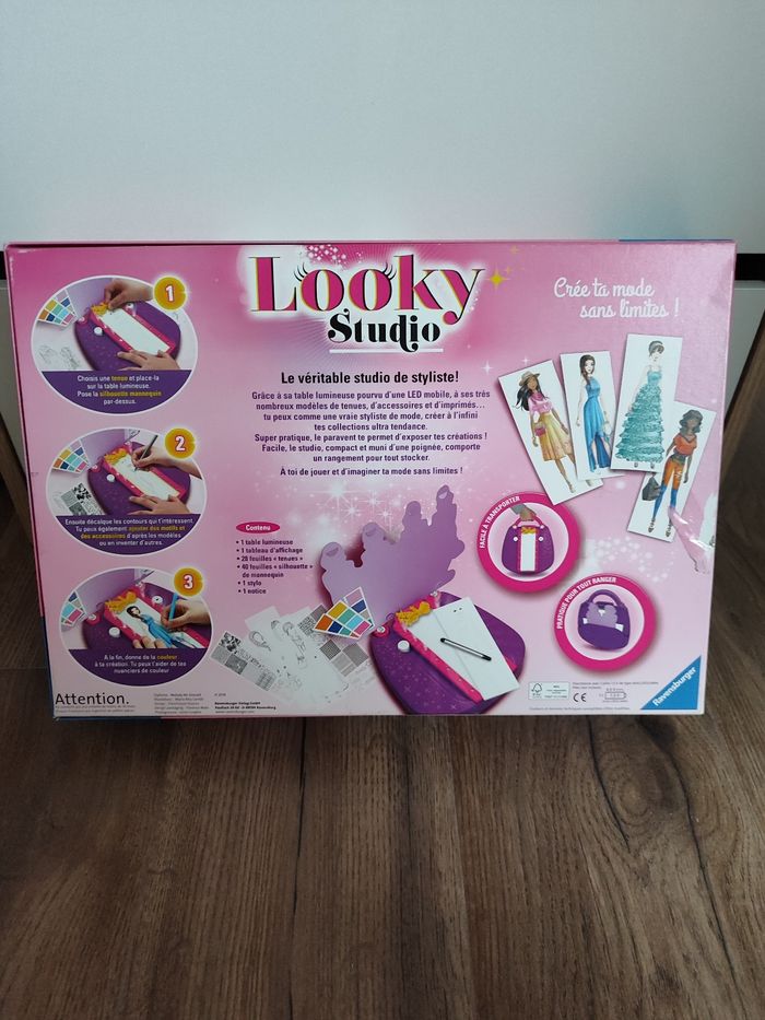 Crée ta mode sans limite avec looky studio Boîte un peu abîmée (voir photos) Fonctionnel, vendu sans pile 1 notice, 1 planche lumineuse, 1 stylo, 1 carnet de 25 silhouettes/40, 1 carnet de 13 feuilles tenues + 13 feuilles détachées, certaines un peu cornées donc 26 feuilles/28