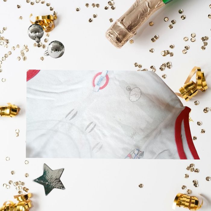Design Adorable : Un fond blanc chic avec des touches de rouge vif pour le col et les bords, et un imprimé discret mais hilarant sur le thème de Londres (on aperçoit même un mini-bus et le célèbre logo du métro !).