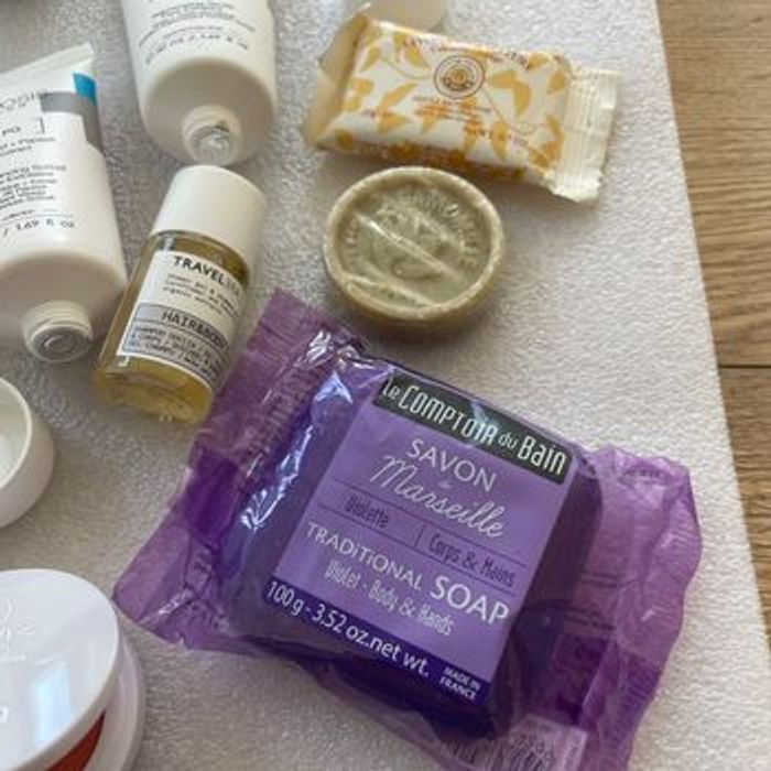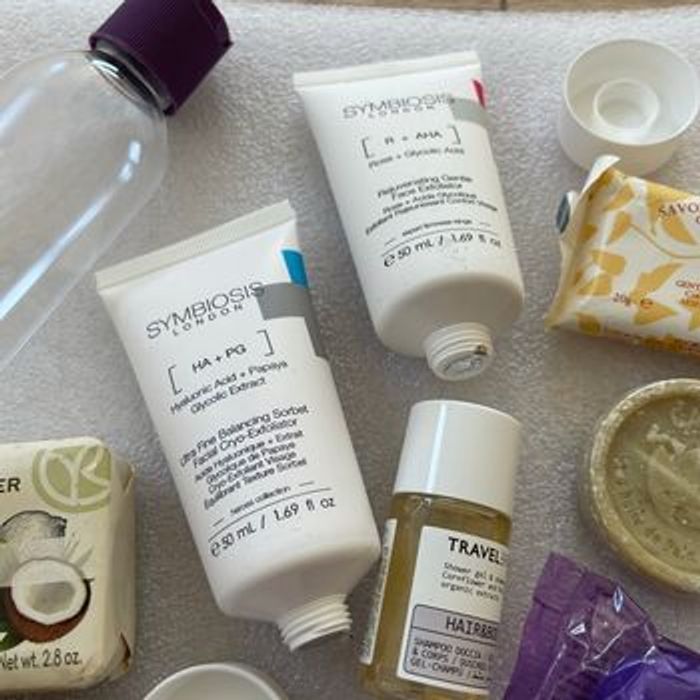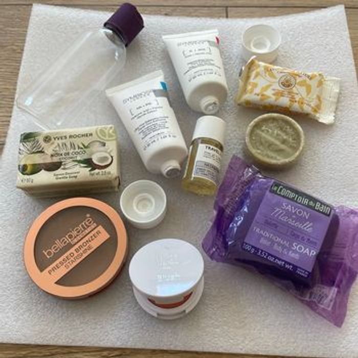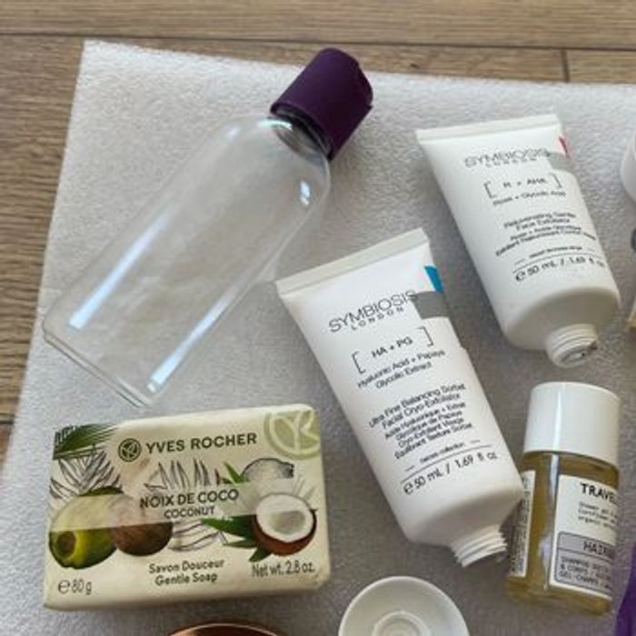 4 Savon emballé, un blush tout neuf une poudre bonne mine un petit gel, douche pour voyager un flacon à remplir pour voyager en avion et deux produits Symbiosis, London, exfoliant pour le visage