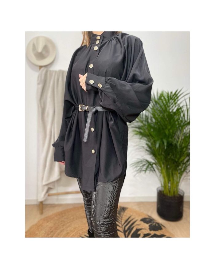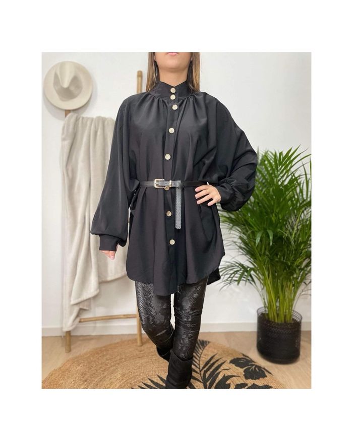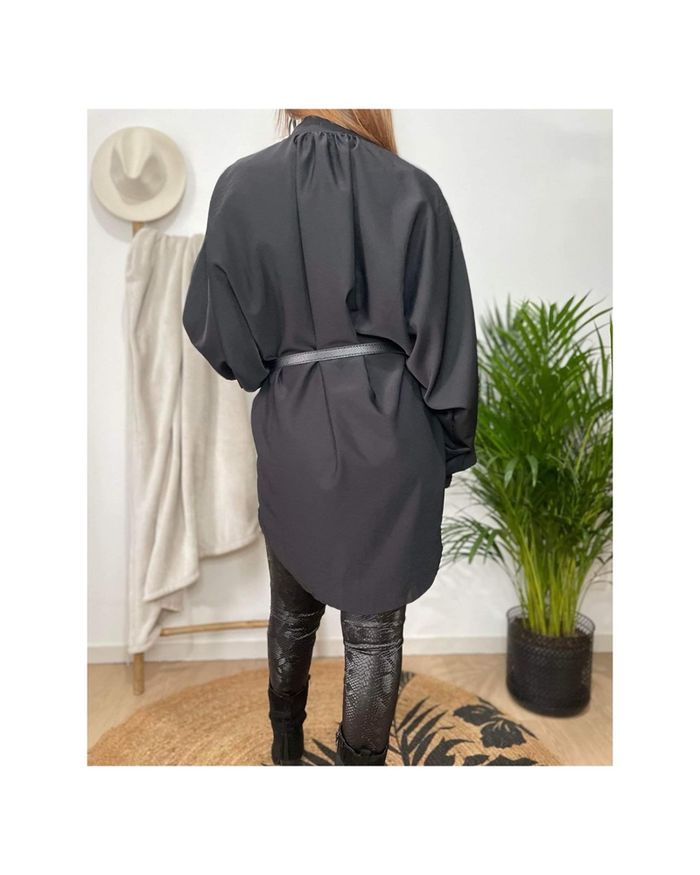🖤 Chemise longue noire à manches chauve-souris et col officier, très élégante et fluide 🎩