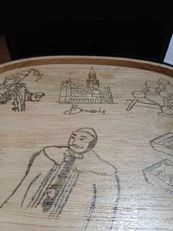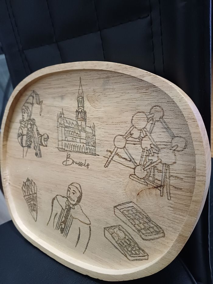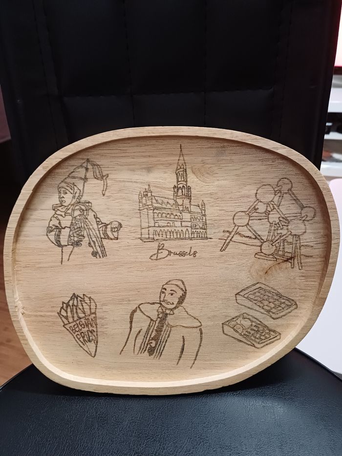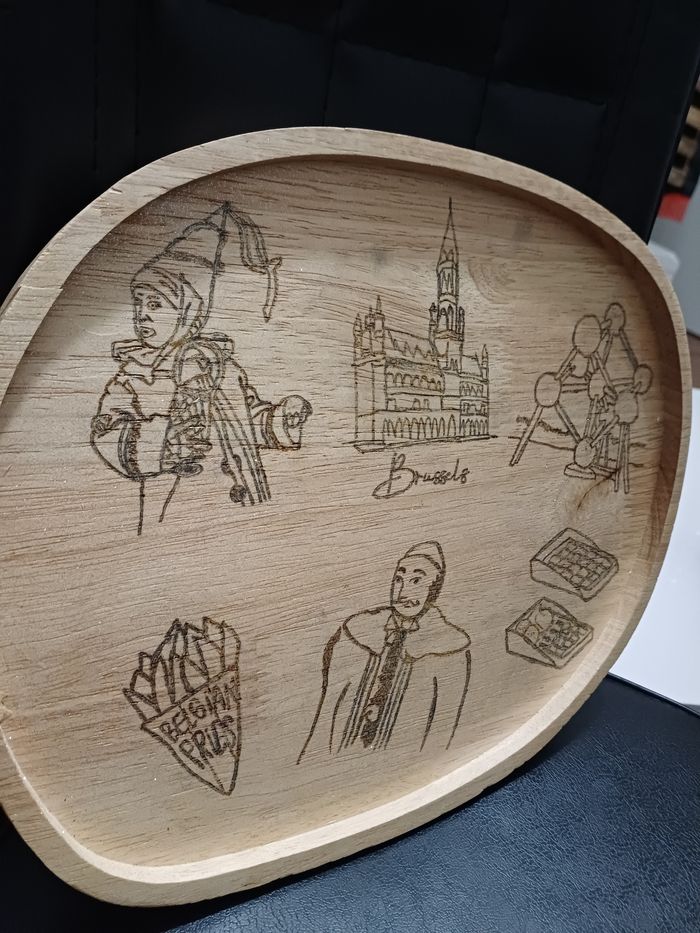 Plateau décoratif .Thème Belgique fait en pyrogravure