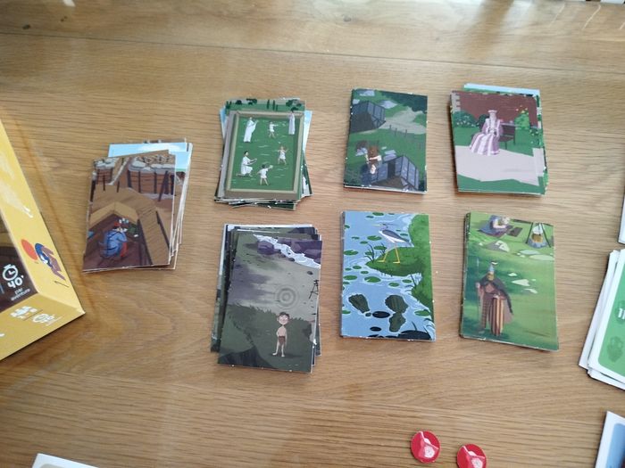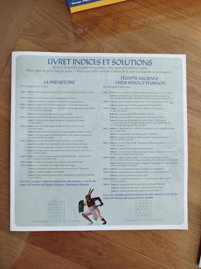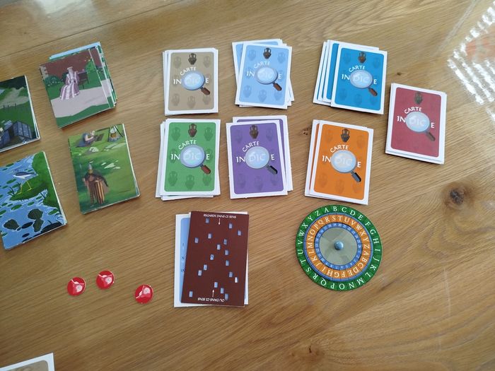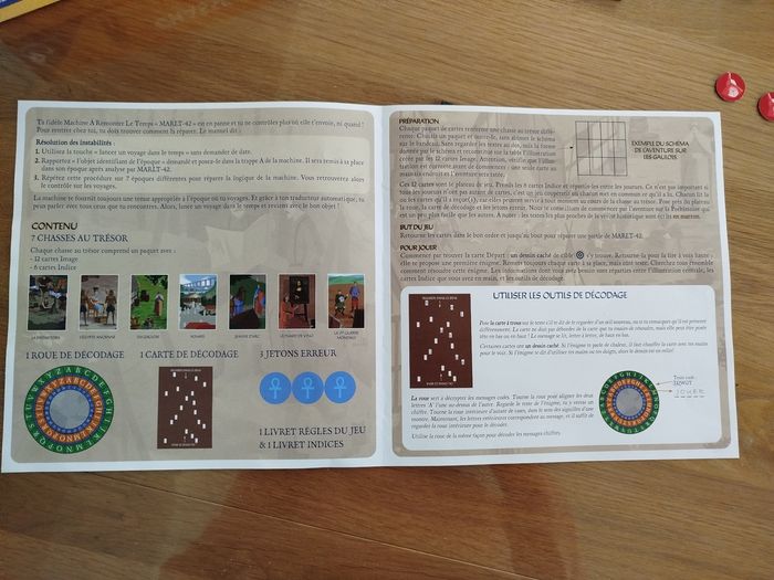 Chaque période comporte 12 cartes et 6 cartes indices. Il y a également une roue et une carte de décodage, et 3 jetons erreur.