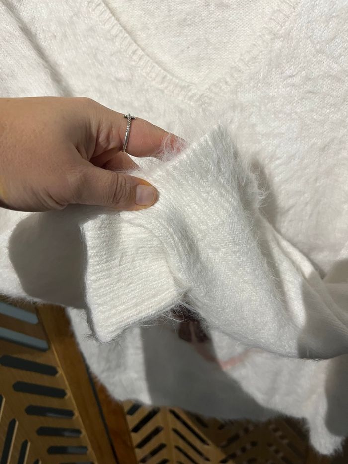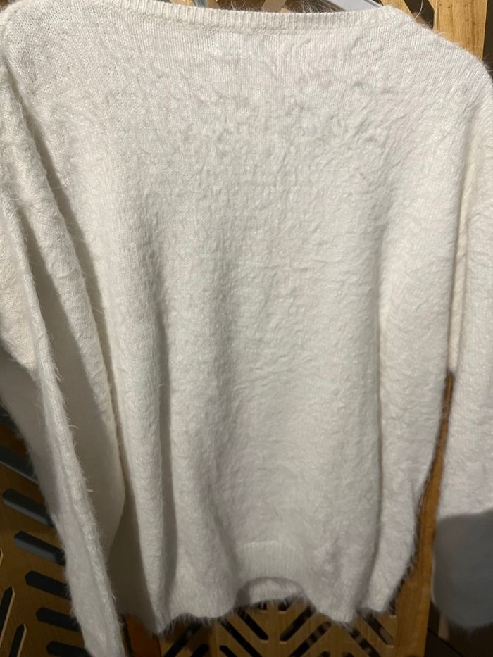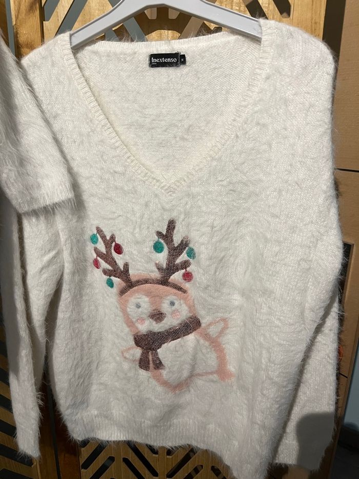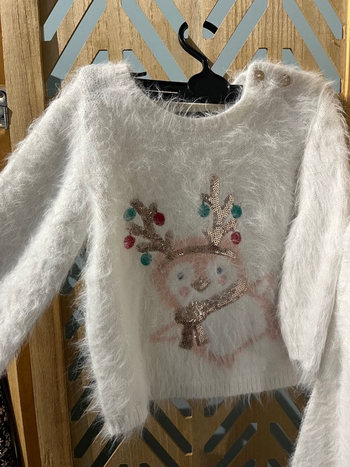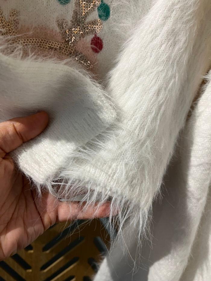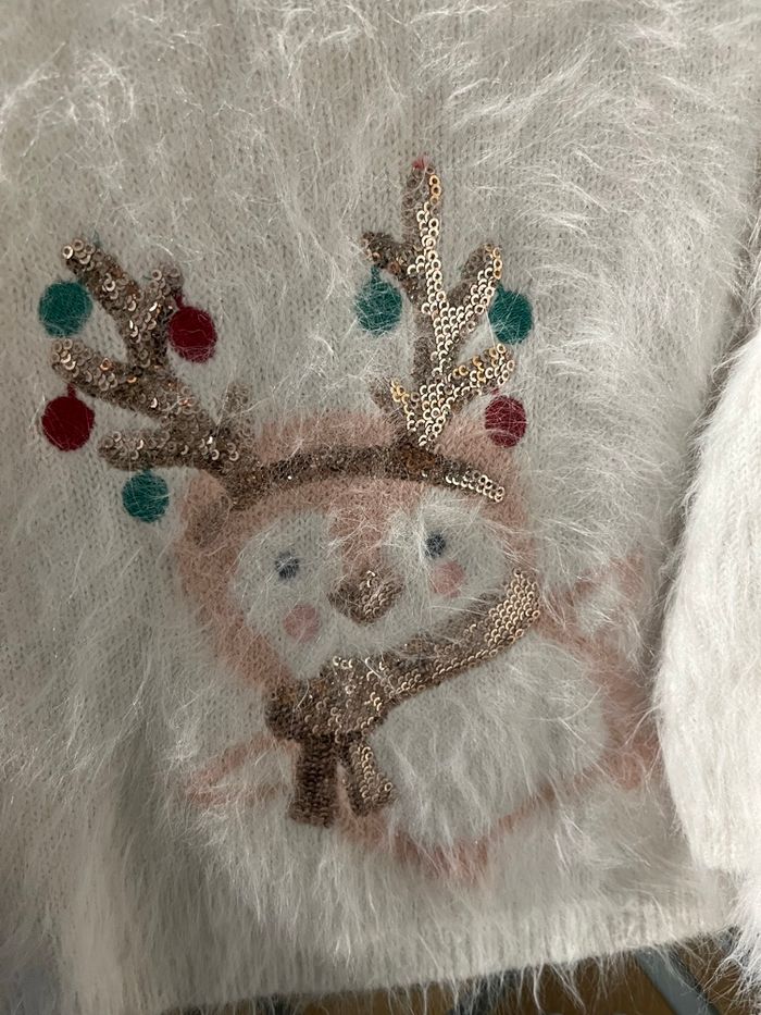 Adorables pulls duveteux blancs avec motif pingouin-renne.