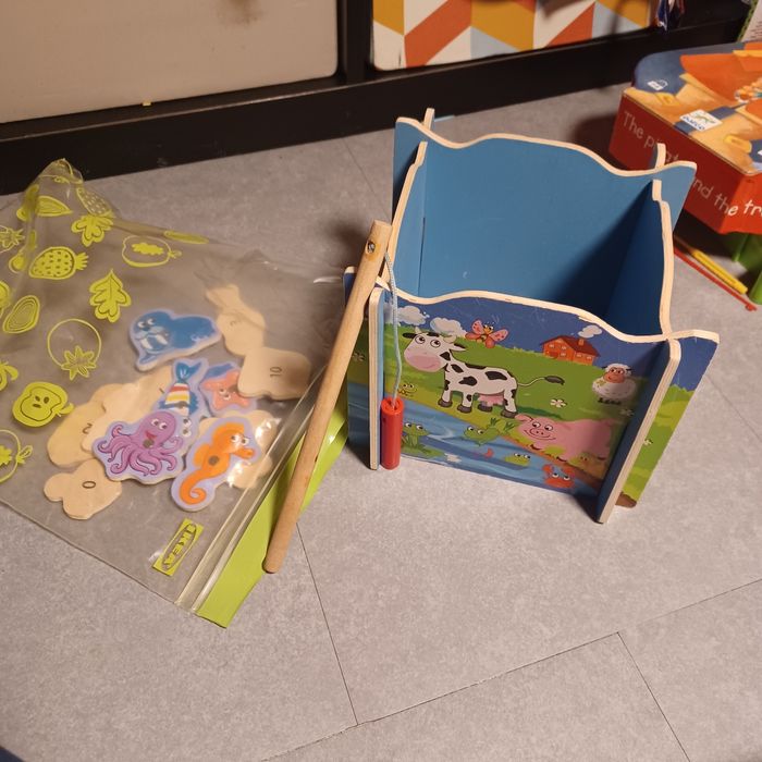 Je vends ce jeu de pêche à la ligne en bois avec ses figurines d'animaux. - Type de produit : Jouet en bois - Âge recommandé : De 0 à 3 ans - Composition du lot : 1 panneau de pêche, 1 canne à pêche, plusieurs figurines d'animaux (vache, poule, etc.) Aimantées Bon état. Un jeu amusant et éducatif pour les tout-petits ! N'hésitez pas à me contacter pour plus d'informations.