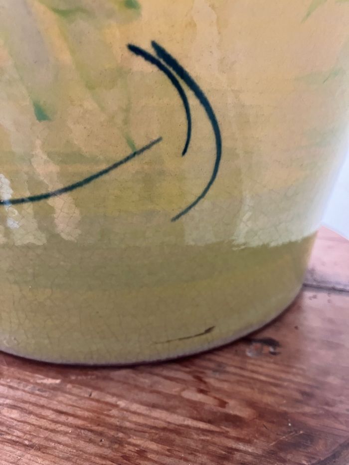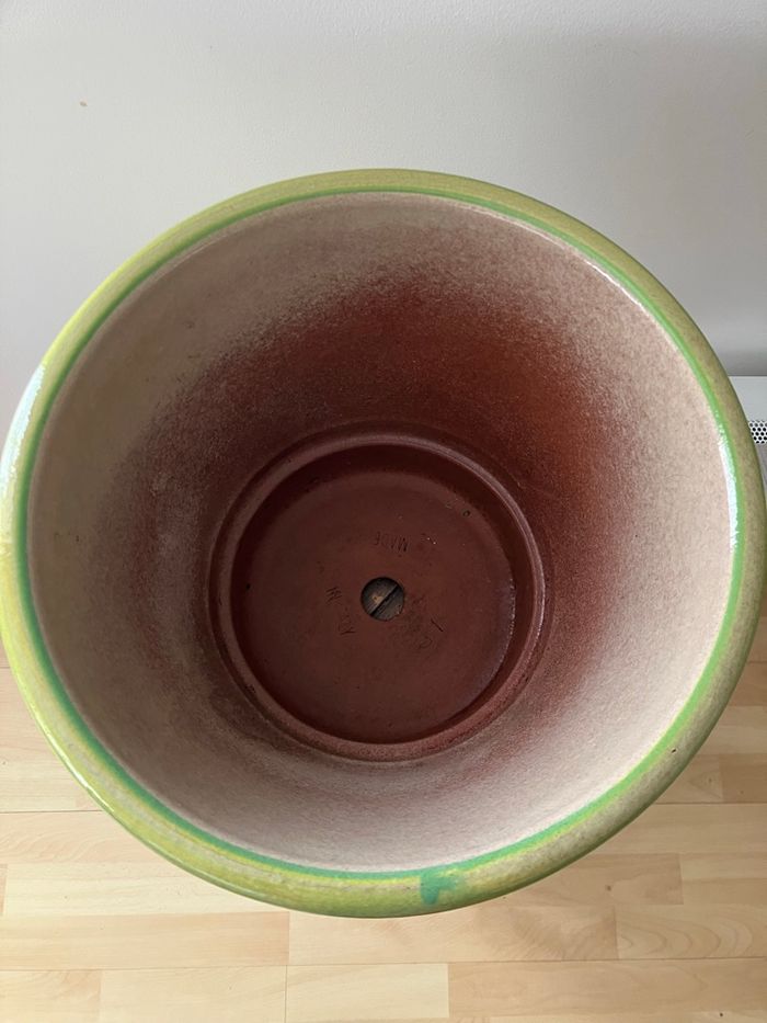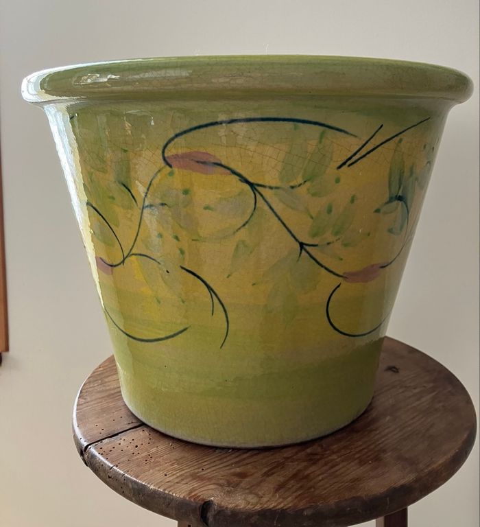 Ce cache pot en terre cuite vernissée est en bon état : pas de manque, pas d’ébréchure, pas de fêlure ⚠️ À noter, je n’ai pas sa « soucoupe » et traces qui ne se retirent pas visibles à un endroit (voir photo). Cela ne nuit pas à son esthétique Joli couleur dans les tons vert et jaune avec des arabesques Fabrication italienne (inscription à l’intérieur au fond du pot) Dimensions : - hauteur : 23 cm - diamètre base : 19 cm - diamètre haut intérieur : 27 cm - diamètre haut extérieur : 30,5 cm Il est lourd : un peu plus de 4 kg