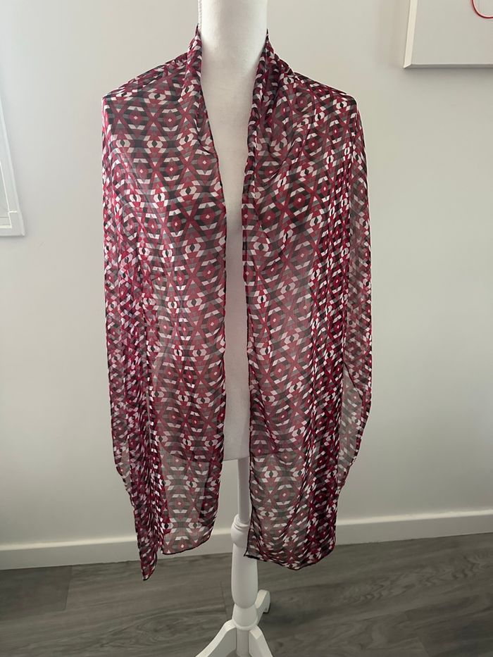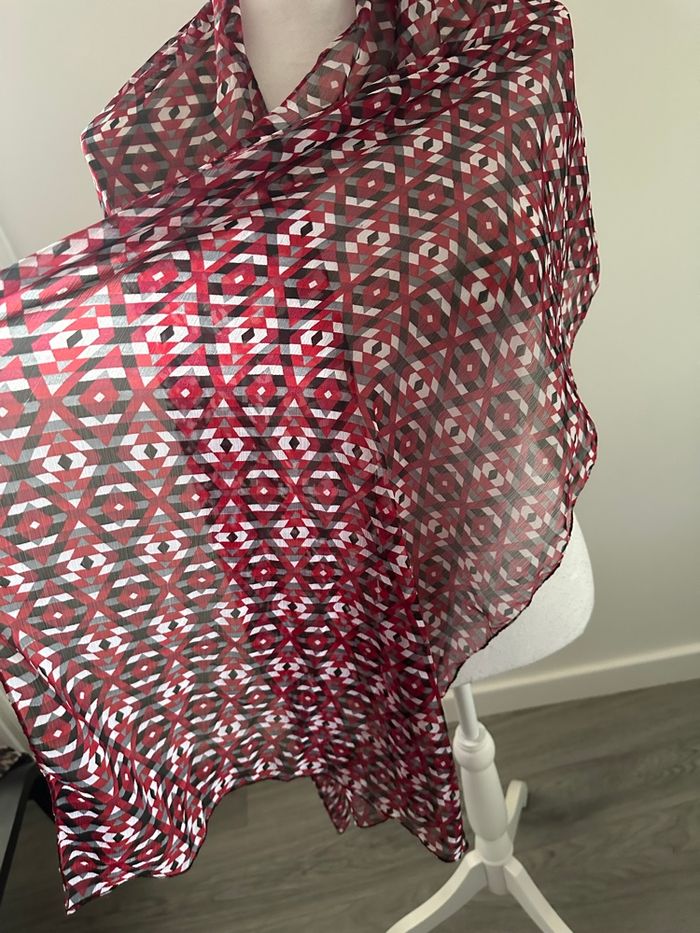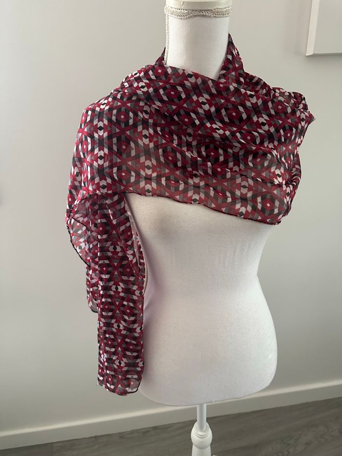 Foulard étole - Excellent état - Rouge bordeaux, noir et blanc - Imprimés géométriques - Tissus transparent - 50x180cm - Pas d’étiquette de matière