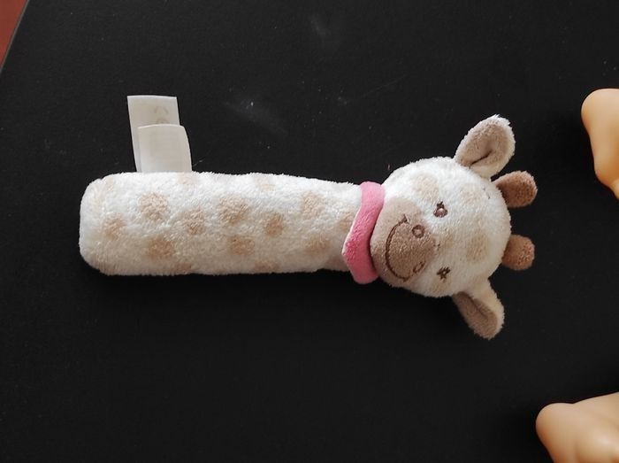 "Lot composé de : 🦒 1 hochet en tissu en forme de girafe – fait du bruit lorsqu’on le presse. Marque : Okaïdi. 🔔 1 anneau hochet pour les dents et la prise en main. ✔️ Adapté pour l’éveil sensoriel et la motricité. ✔️ Faciles à attraper par bébé. 📌 Bon état, propres et prêts à l’usage."