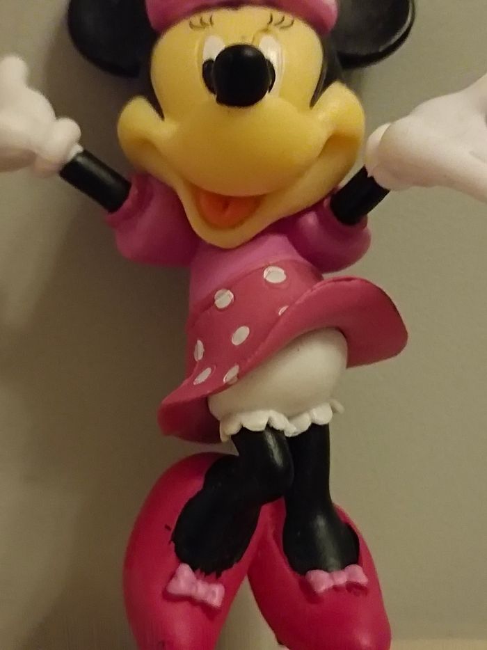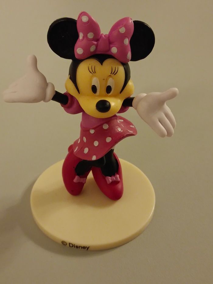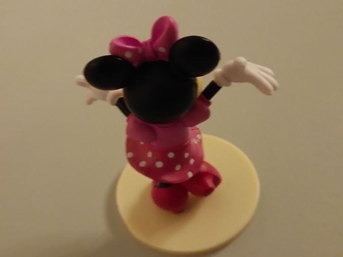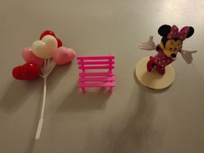 Ce produit comprend une figurine de Minnie Mouse portant une robe à pois blancs et un noeud assorti. Il inclut un banc de couleur rose et un ornement en forme de ballons multicolores reliés par une corde. Ces décorations sont exclusivement décoratives et ne doivent en aucun cas être ingérées.