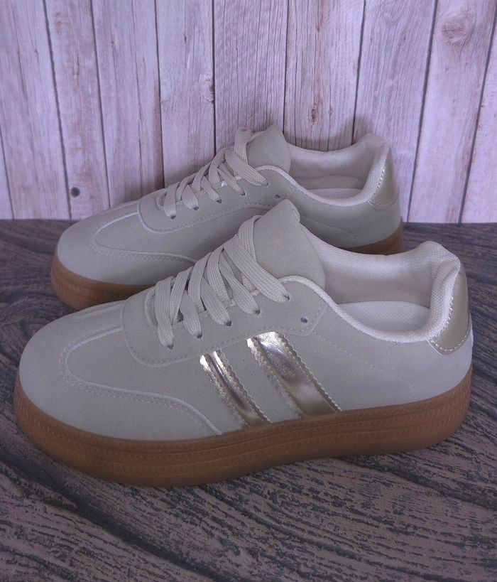 🌟 EXCLUSIF : Baskets femmes beige doré neuves. Idéales pour le quotidien ou la mode urbaine.