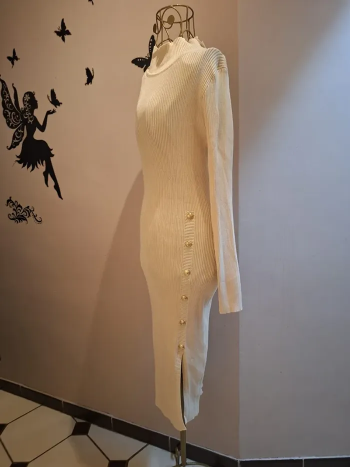 Robe pull crème en mailles côtelées -col montant - boutons officiers sur un coté - légèrement fendue sur le coté - longueur 108 cm - coupe cintrée et moulante : la matière est extensible et s'adapte à votre morphologie - taille unique idéale pour les tailles S & M ou 36 & 38 -état sans défaut ps : je ne fais pas de photo portée #robepull #robepullcrème #robehiver