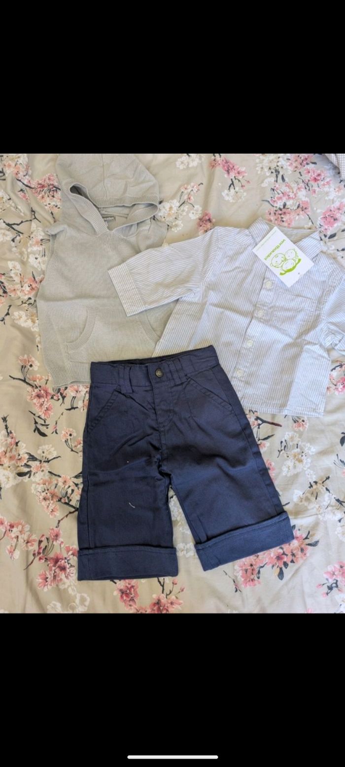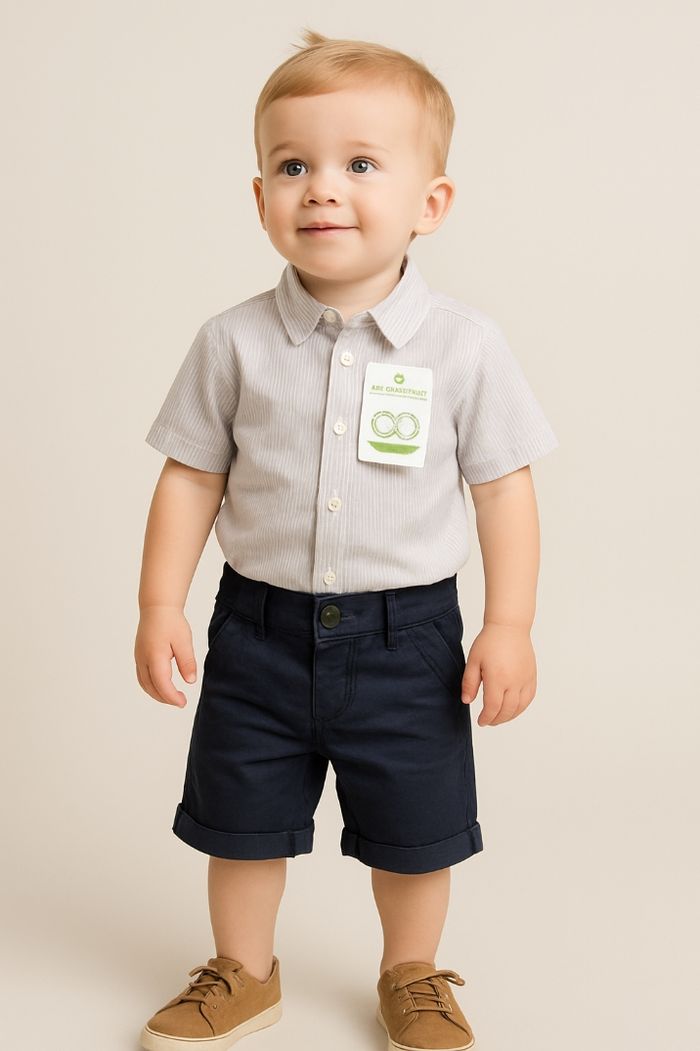 Joli ensemble bébé garçon composé d’une chemise à manches courtes à fines rayures et d’un short bleu marine.