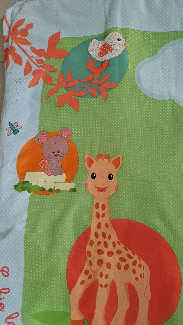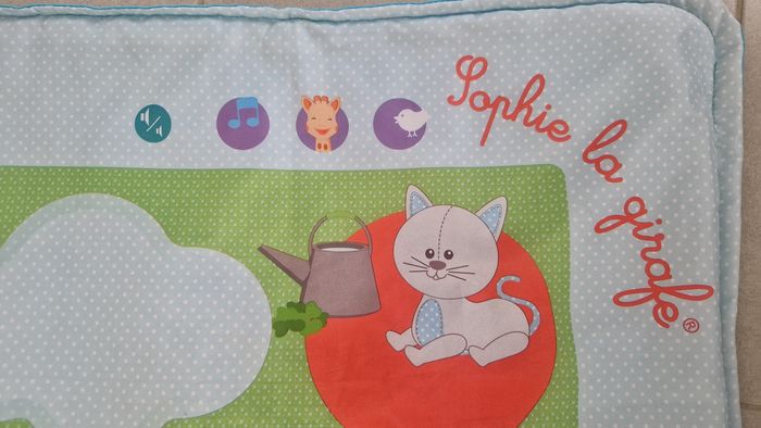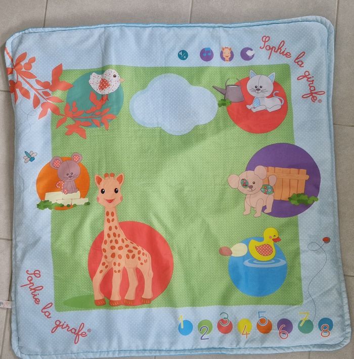 Tapis musical Sophie la girafe très bon état une coupure sur le derrière de la housse. Déhoussable. Fait de la musique, des sons d'animaux et des notes de piano.