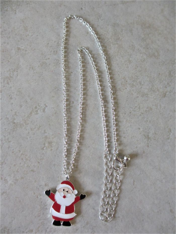 Collier fantaisie enfant : chaîne et pendentif Père-Noël Longueur chaîne : 45 cm. Très bon état (comme neuf, porté 1 fois).