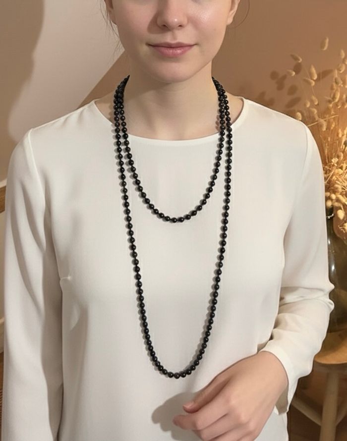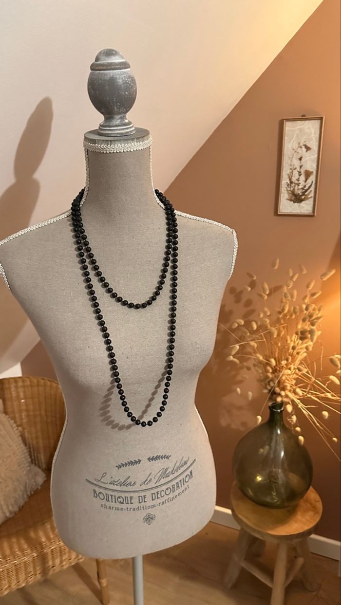 Joli collier de perles noires en plastique, parfait pour compléter une tenue chic, rétro ou élégante.