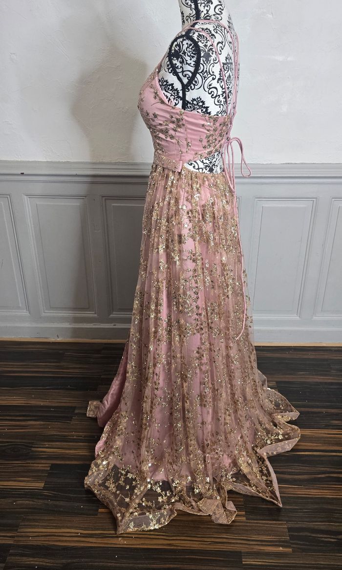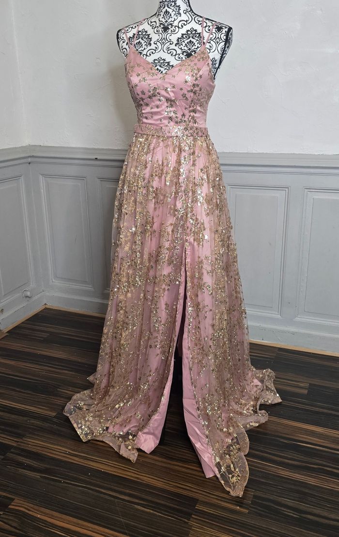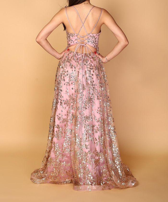 Robe de soirée longue couleur vieux rose avec motif pailleté or.