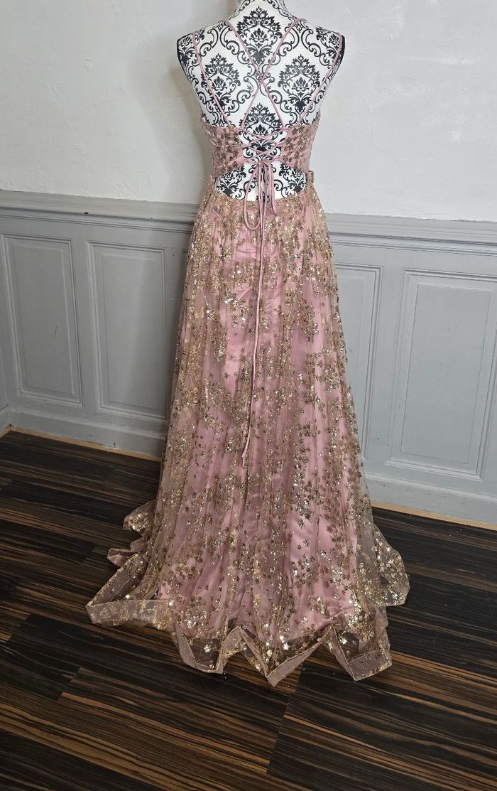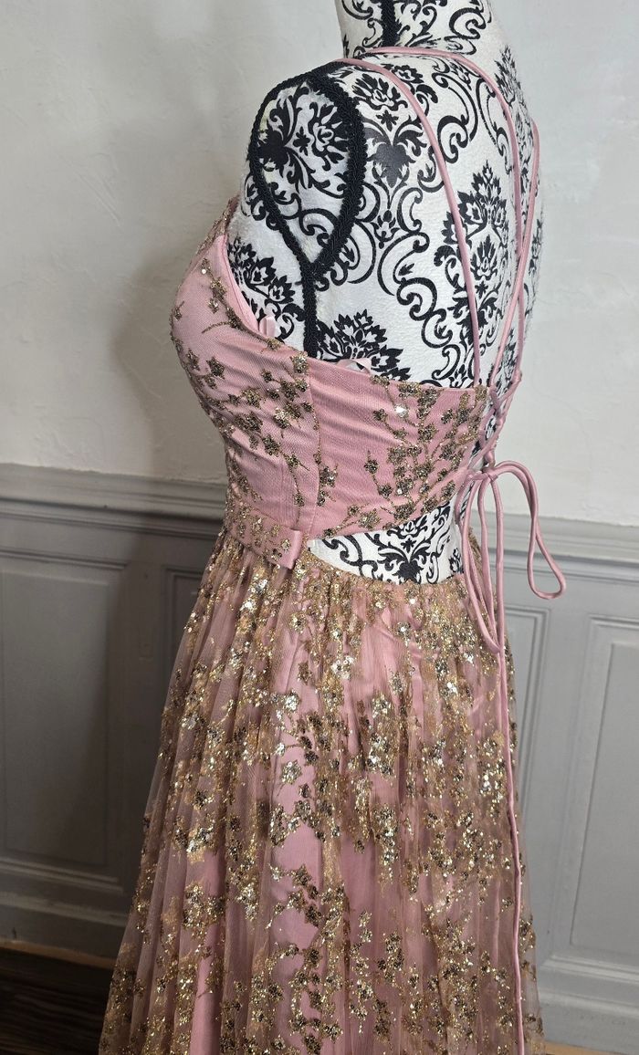Robe de soirée longue couleur vieux rose avec motif pailleté or.