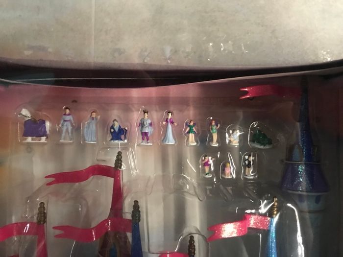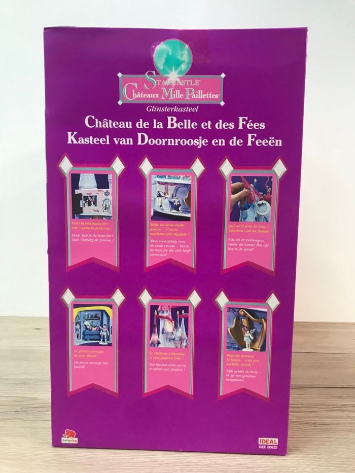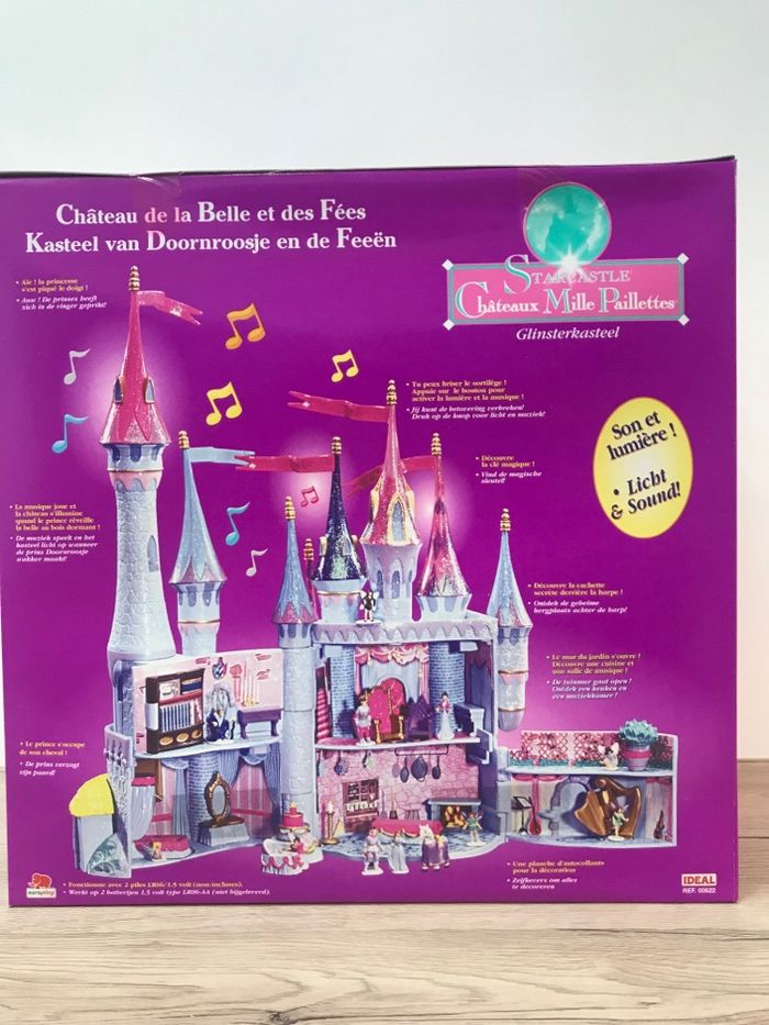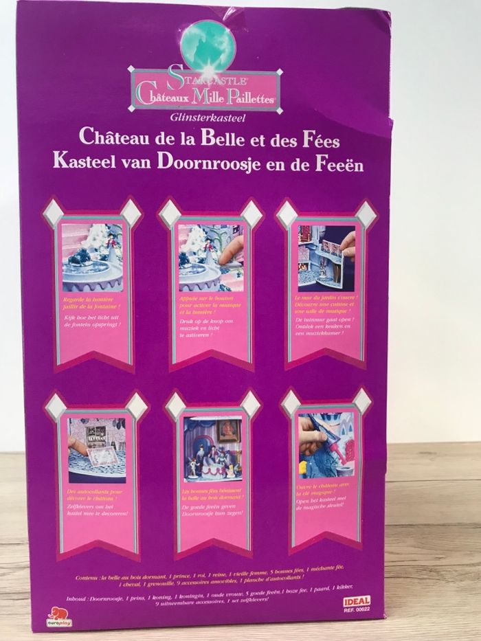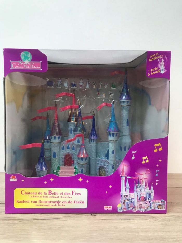 Contenu : un château et sa clé magique pour l' ouvrir et le déplier, la Belle au bois dormant, un prince, un roi, une reine, une vieille femme, 5 bonnes fées, une méchante fée, un cheval, une grenouille, 9 accessoires amovibles
