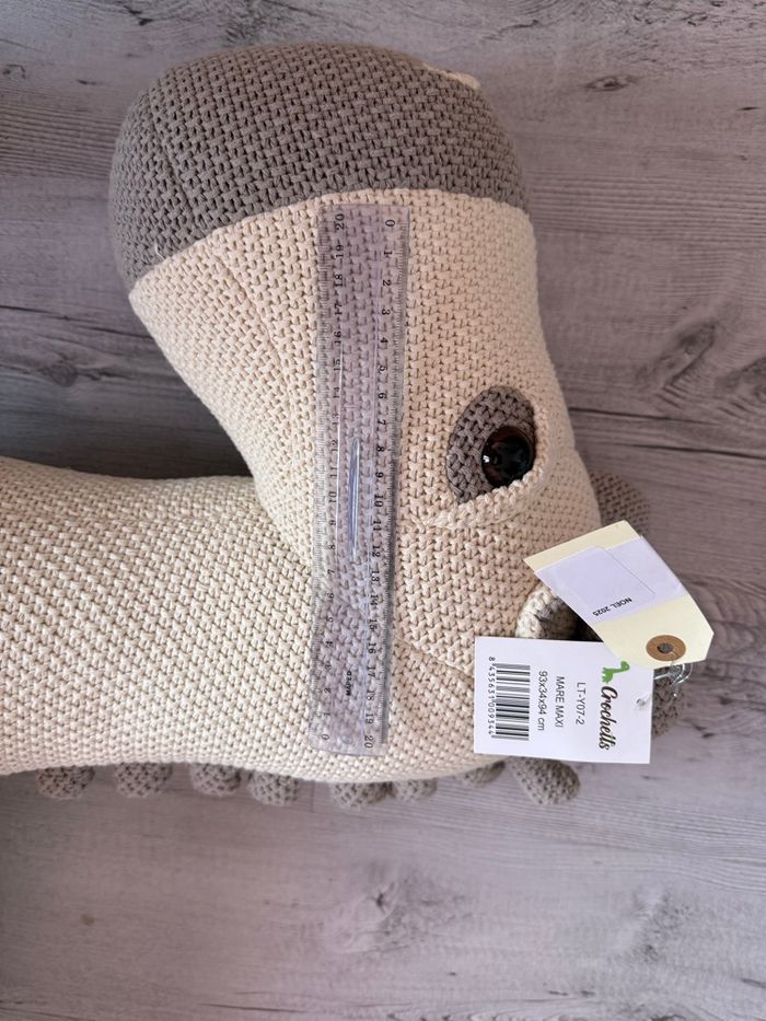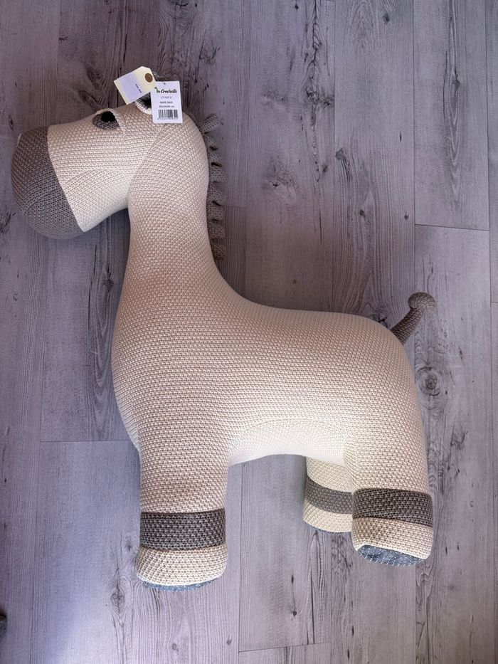 Neuf Cette grande peluche-siège d’appoint en forme de cheval, confectionnée en 100% coton doux et hypoallergénique, dispose d’une structure interne en bois de pin capable de supporter jusqu’à 70 kg. Grâce à ses semelles antidérapantes, elle offre une assise stable et sécurisée pour les enfants. Son généreux format et son design chaleureux en font un compagnon idéal pour jouer, se détendre ou apporter une touche décorative douce et poétique à la chambre. Pour rendre l’expérience encore plus magique, chaque peluche est envoyée avec une petite lettre de présentation destinée à l’enfant, créant un moment unique et plein d’émotion dès l’ouverture du colis. Crochetts est une marque née de la passion pour l’artisanat textile et l’univers de l’enfance. Chaque création est imaginée à partir de dessins originaux, puis réalisée avec des matières douces et des finitions soignées pour offrir des pièces uniques, chaleureuses et pleines de personnalité. Inspirée par les souvenirs d’enfance et l’amour du fait main, Crochetts propose des produits poétiques et réconfortants, pensés pour accompagner les tout-petits dans un univers tendre, authentique et rempli de magie.Couleur : - white and grey voir photo / Blanc et gris Composition Matière principale : COTON Caractéristiques techniques Age minimum : 18 mois Poids et dimensions Dimensions : 80 x 25 x 85 cm