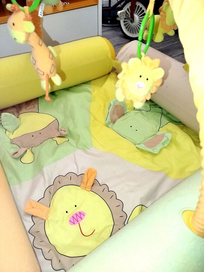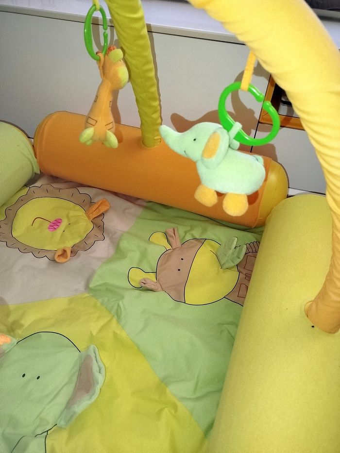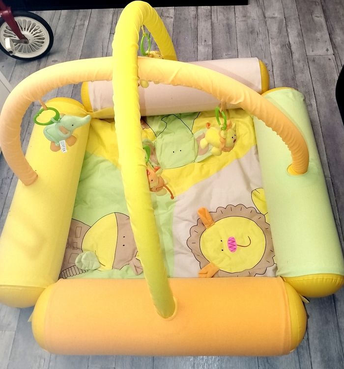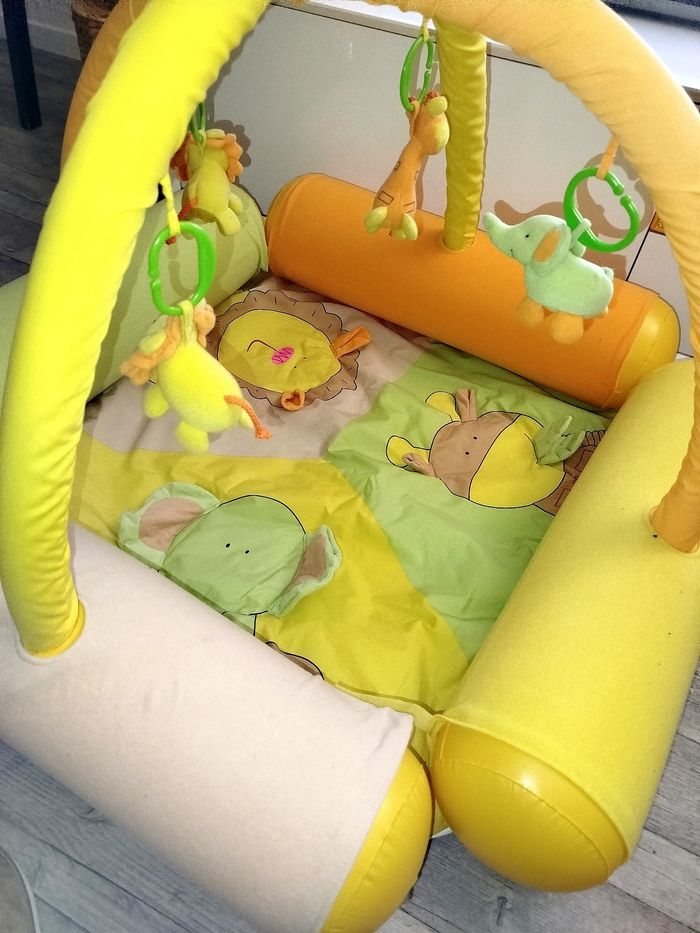 🎄 Comme Neuf, a été utilisé 2-3 fois. Aire d'éveil gonflable avec des gros boudins.. Le gonfleur est fourni Tapis d'éveil assez epais... Avec matières à toucher .. ( effet papier froissé..) Les petits animaux se détachent .