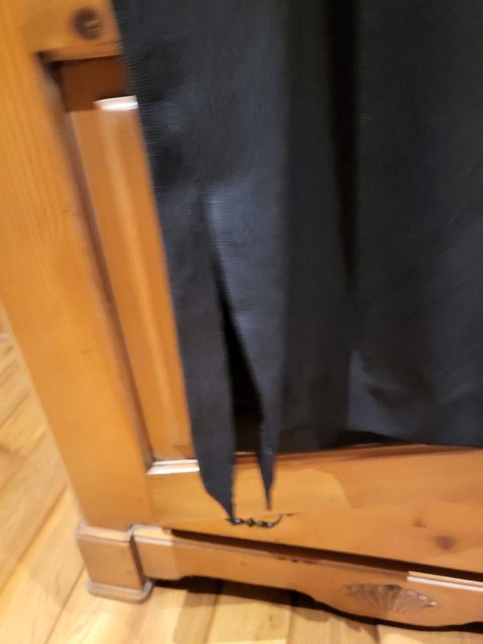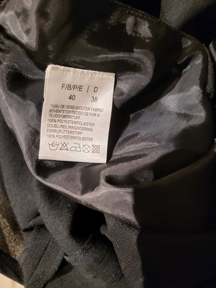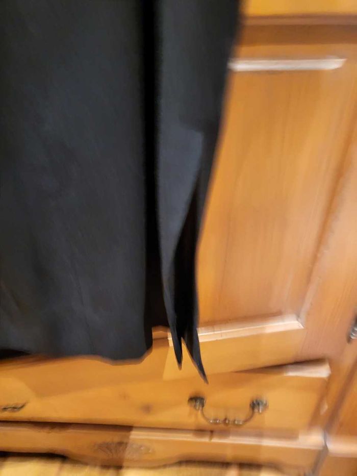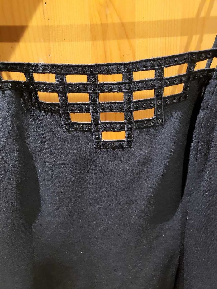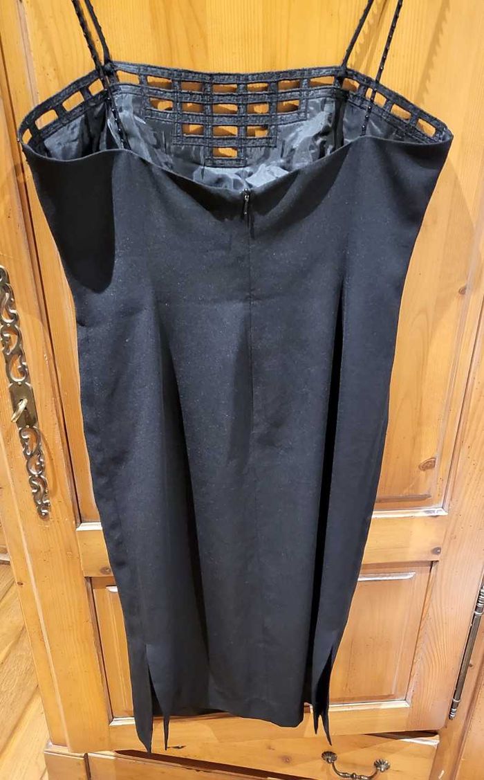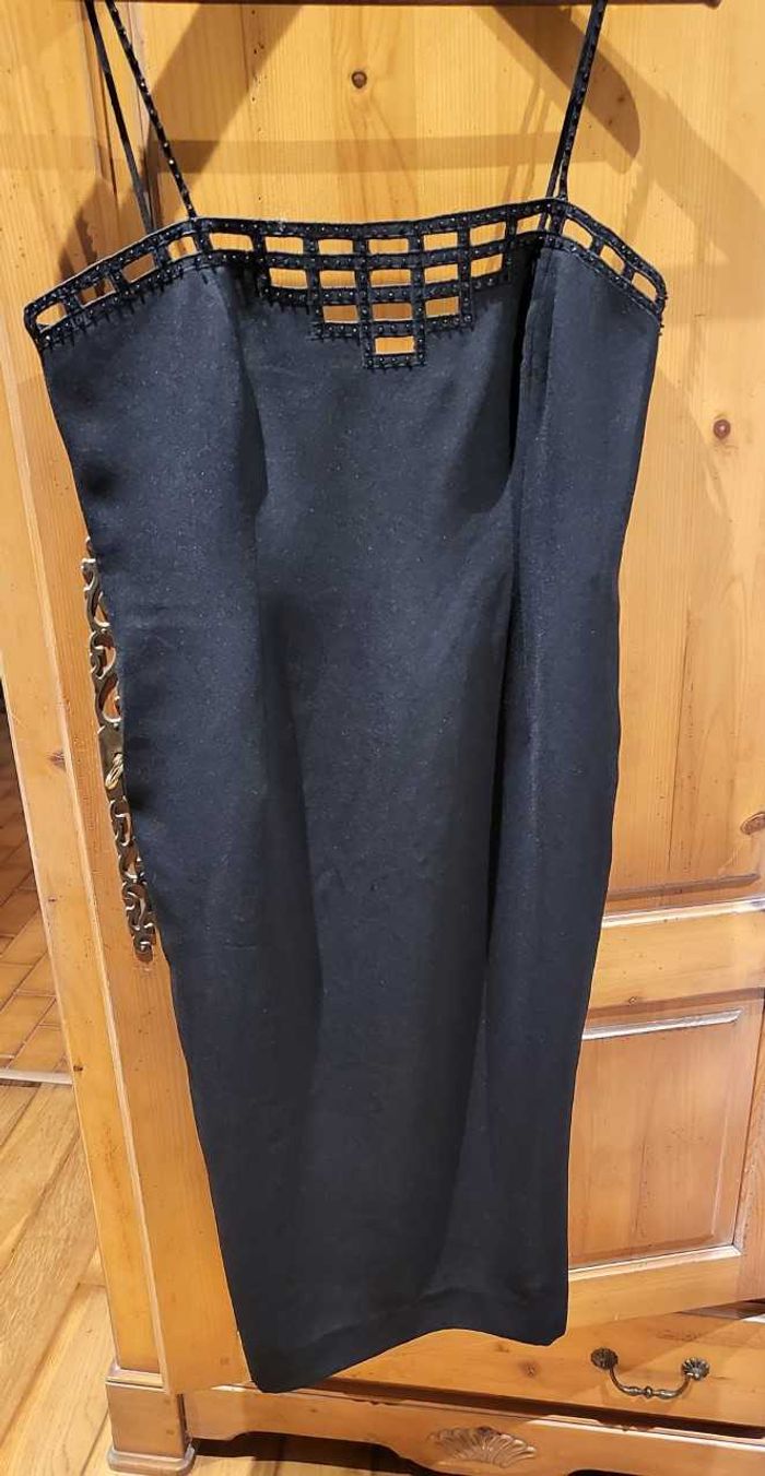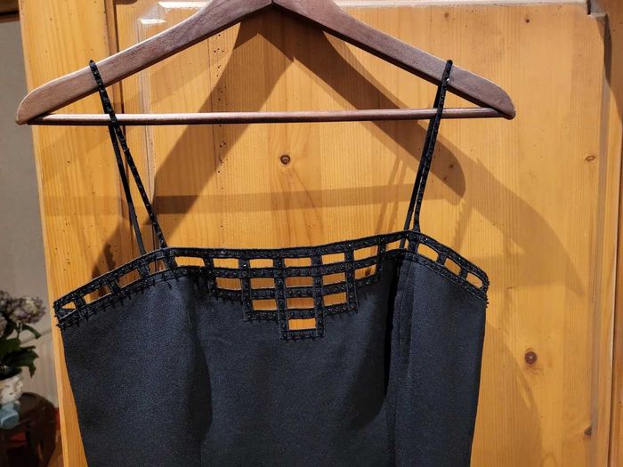 Robe de soirée à bretelles (elles ne sont pas réglables). Légère. Taille 40. Elle est fendue sur les côtés (voir photo). Elle arrive au niveau des genoux. Couleur : noir. Marque : je ne sais plus.