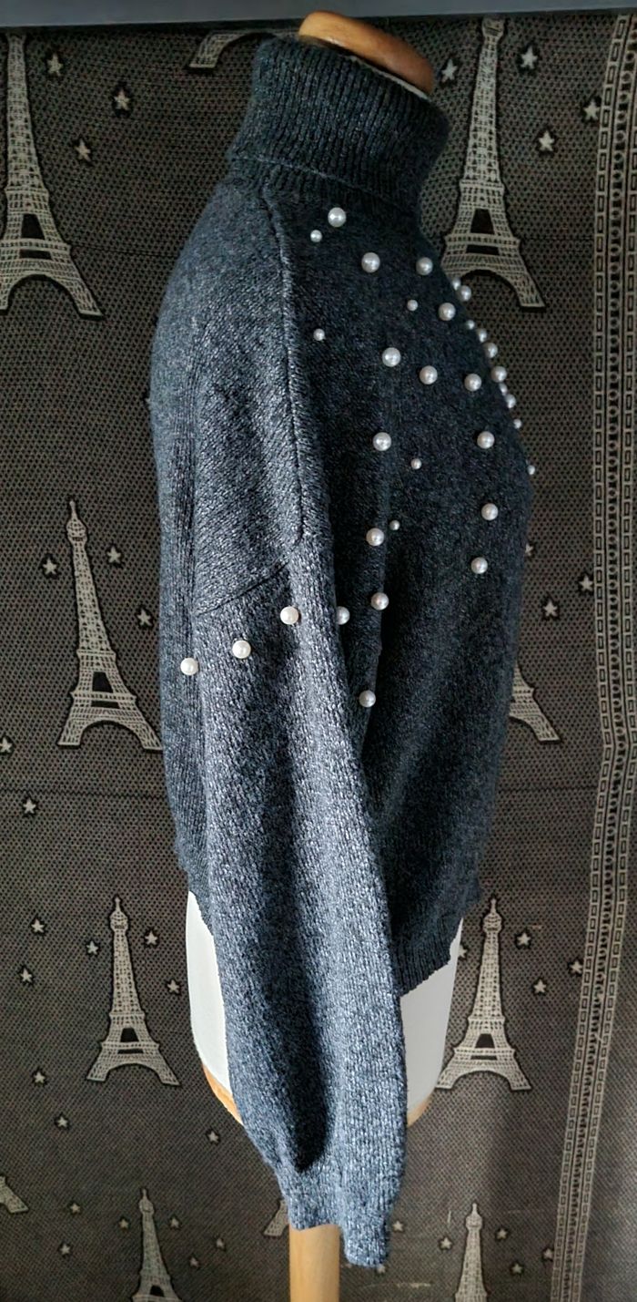 Pull court à col roulée avec perles,taille S-M marque Jennyfer, longueur 50cm, largeur 51cm, longueur épaule à aisselle 23cm,largeur aisselle à aisselle 58cm, longueur manche 45cm.